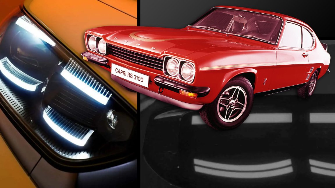 Composition of Ford Capri EV teasers with an old Capri three-quarter image superimposed.
