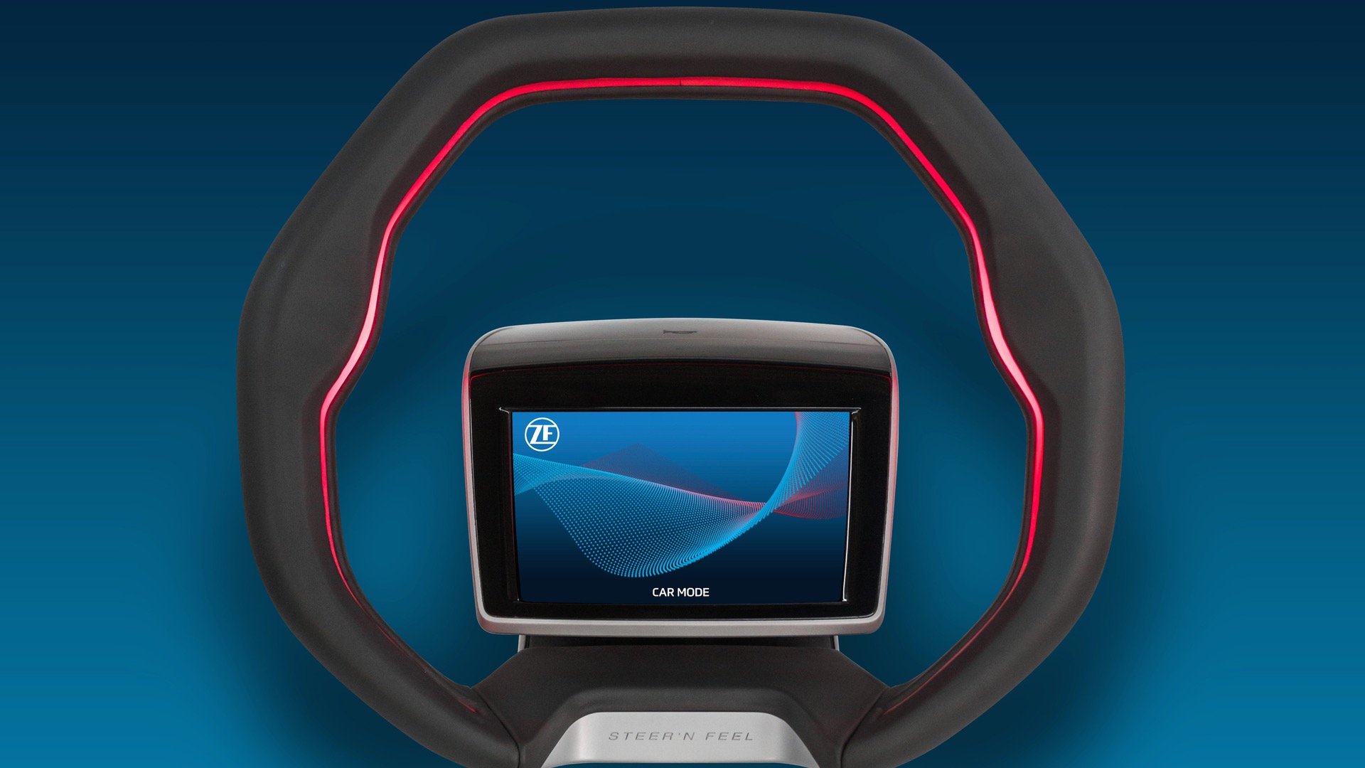 As if there weren’t enough display screens on car dashboards already, ZF stuck a 7-inch LCD screen right in the middle of the wheel. This necessitated redesigning the airbag so that it deploys from the back side of the wheel through the rim.