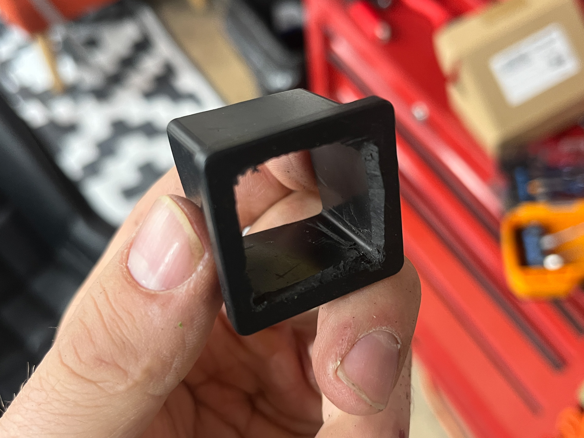 For the finishing touch, I put grommets on the mounting tubes to fill the tiny gap between the light mounting squarestock and the new Delrin bezel. This covered up my hacky hand cuts nicely, too. Where’d I find square grommets, you ask? Hah! I didn’t, I made them by hand by taking furniture feet I found on Amazon and cutting out the middle.