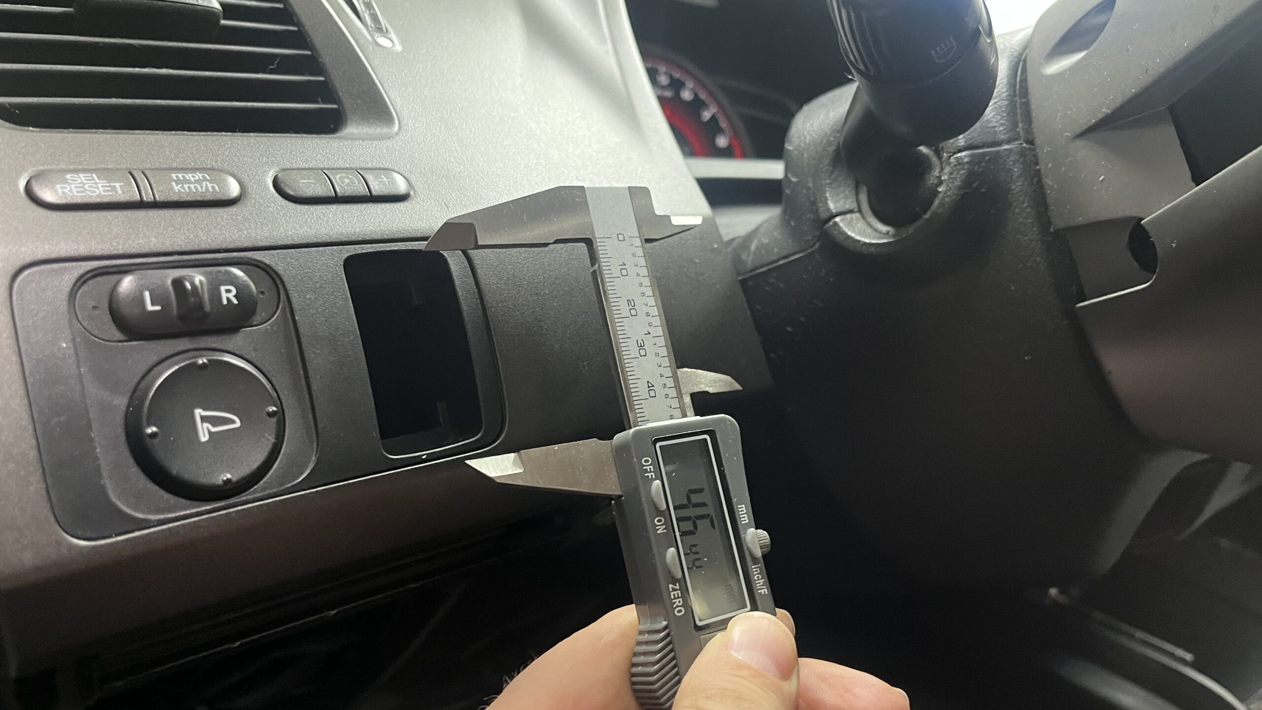 I needed to mount the KC lights’ power switch in the Civic, and I needed it to look good. I adore the eighth-gen Civic Si interior and didn’t want to mar it with an awkwardly drilled off-road light switch, but at the same time, I really wanted to use the switch KC supplied. It looked cool and well-made and I really didn’t feel like sifting through however many three-position toggles are for sale online. Putting the toggle switch in the factory fog light switch location was the most appealing choice because it meant I wouldn’t need to drill into my dash or center console. But I also meant I’d have to figure out how to put a round switch in a rectangular slot.