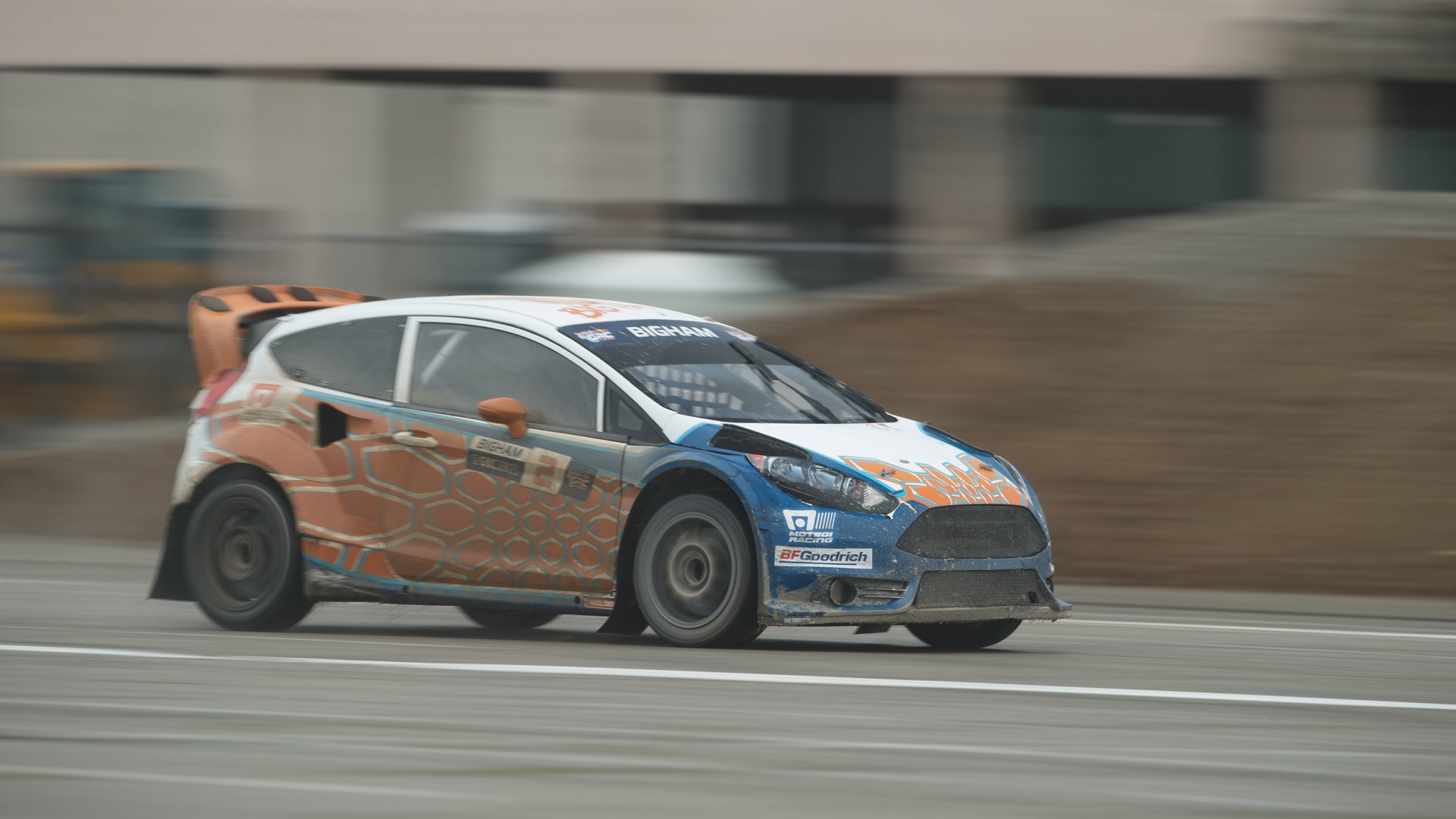 Last year’s Red Bull Global Rallycross Lites champion, rookie Cabot Bigham, moved up to Supercars this year and got a taste of playing with the big boys this past weekend at Thompson Speedway. After taking second place in Heat 1A, his Bryan Herta Rallysport Ford Focus got mixed up with the Honda Red Bull OMSE Civic of Mitchell deJong, taking out the tire barrier and part of the wall after the jump before crossing the oval track. Drivers had to dodge the tire barrier still in the middle of the track on the next lap, but Bigham, then in last place, kindly bumped it off the racing line on his next lap.