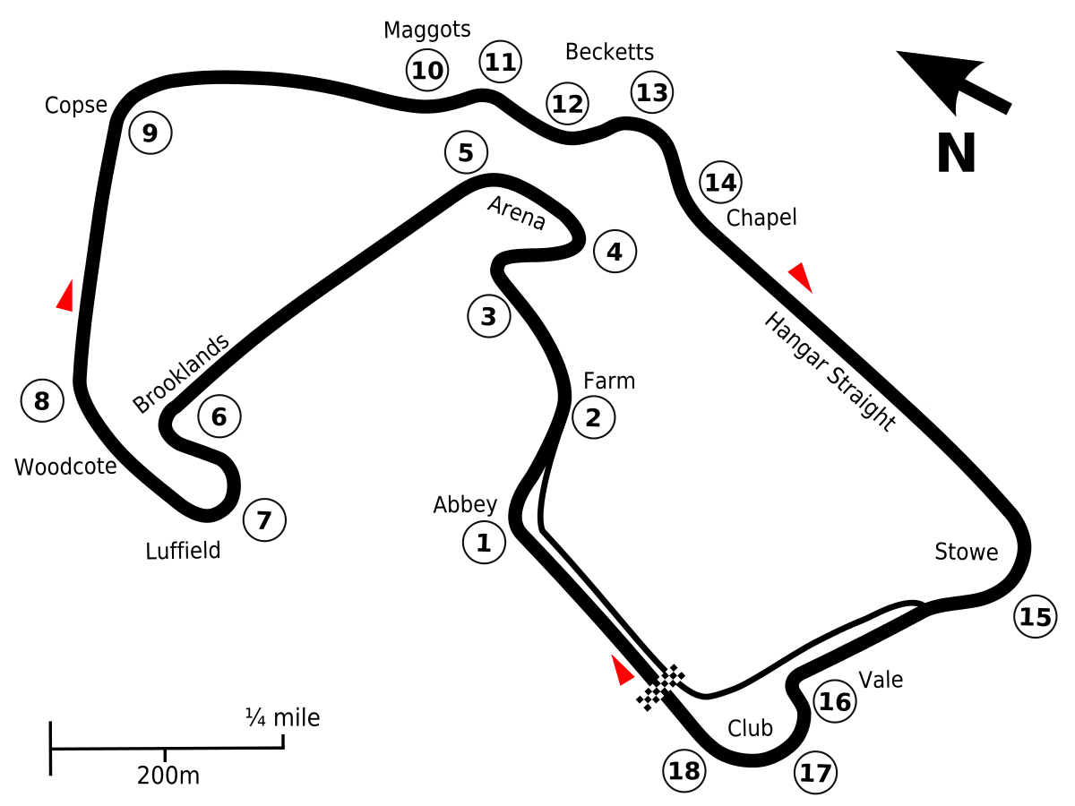 In response to the faster cornering speeds, additional barriers have been added around the track. F1 Fanatic reports that extra tires and TecPro barriers are in place at “Abbey (turn one), Farm (turn two), Brooklands (turn six), Copse (turn nine), Stowe (turn 15) and Vale (turn 16).” As you can see from the track map, those are the fastest corners and/or approaches of the track. For example, the cars are taking Copse flat-out and not braking until the turn-in for Turn 11.