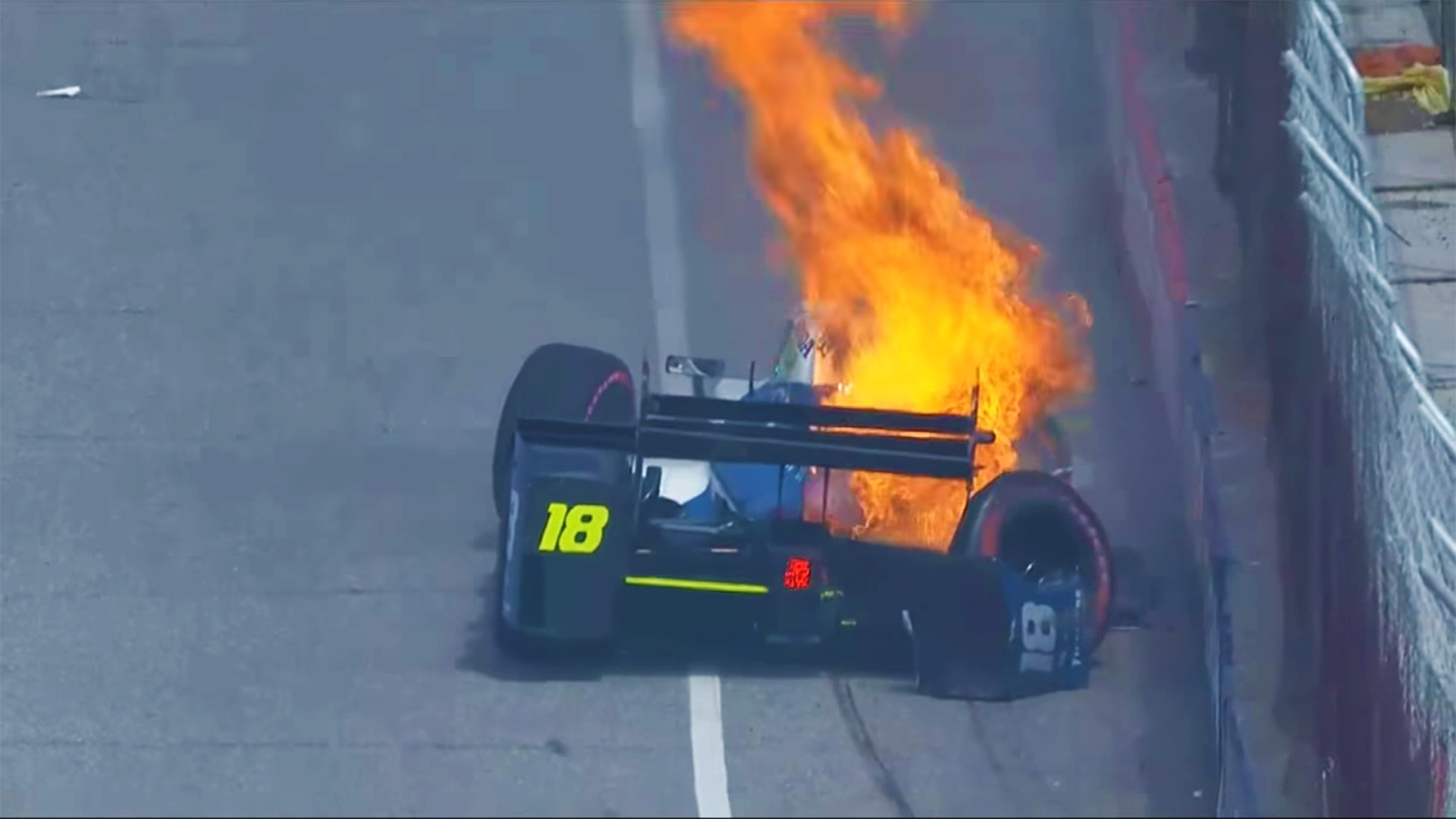 In qualifying for the IndyCar’s street race in Toronto, Esteban Gutierrez hit the wall hard. He went wide in turn 11, hitting the outside wall with the right side of the car. After the car came to rest down the track, the rear erupted into flames, most likely the result of oil lines getting damaged in the impact. Besides the fire, the entire right side of the car sustained heavy damage.
