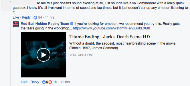 Don’t get all sappy in your Facebook comments about the difference in sound, either, or Red Bull Holden Racing Team will roast you with this profanity-laden Titanic parody.