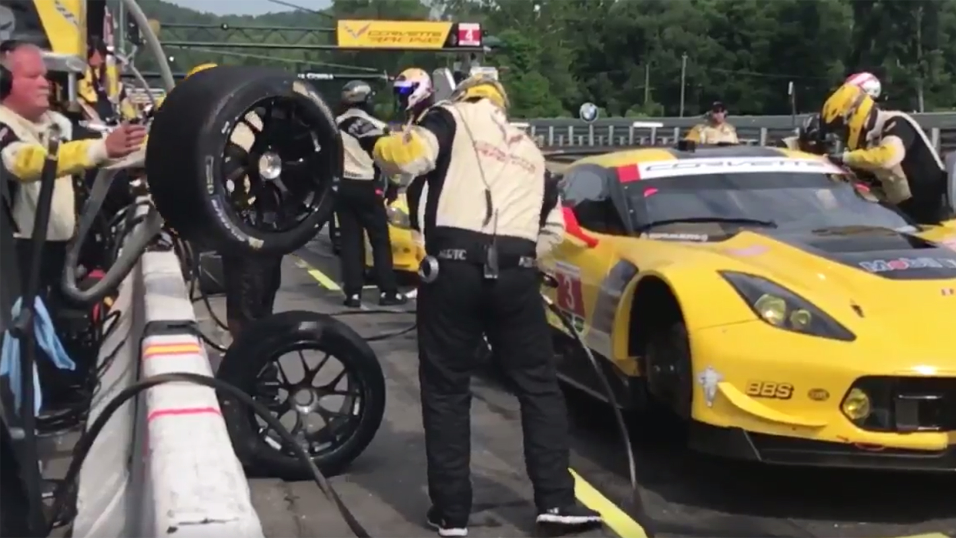 Corvette Racing is getting the job done in the pits today. The No. 3 Corvette, which is leading as of writing this, came in for a stop not too long ago. The crew put on a clinic on doing it right in the pits.