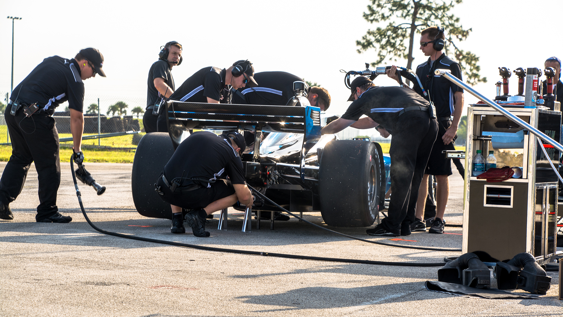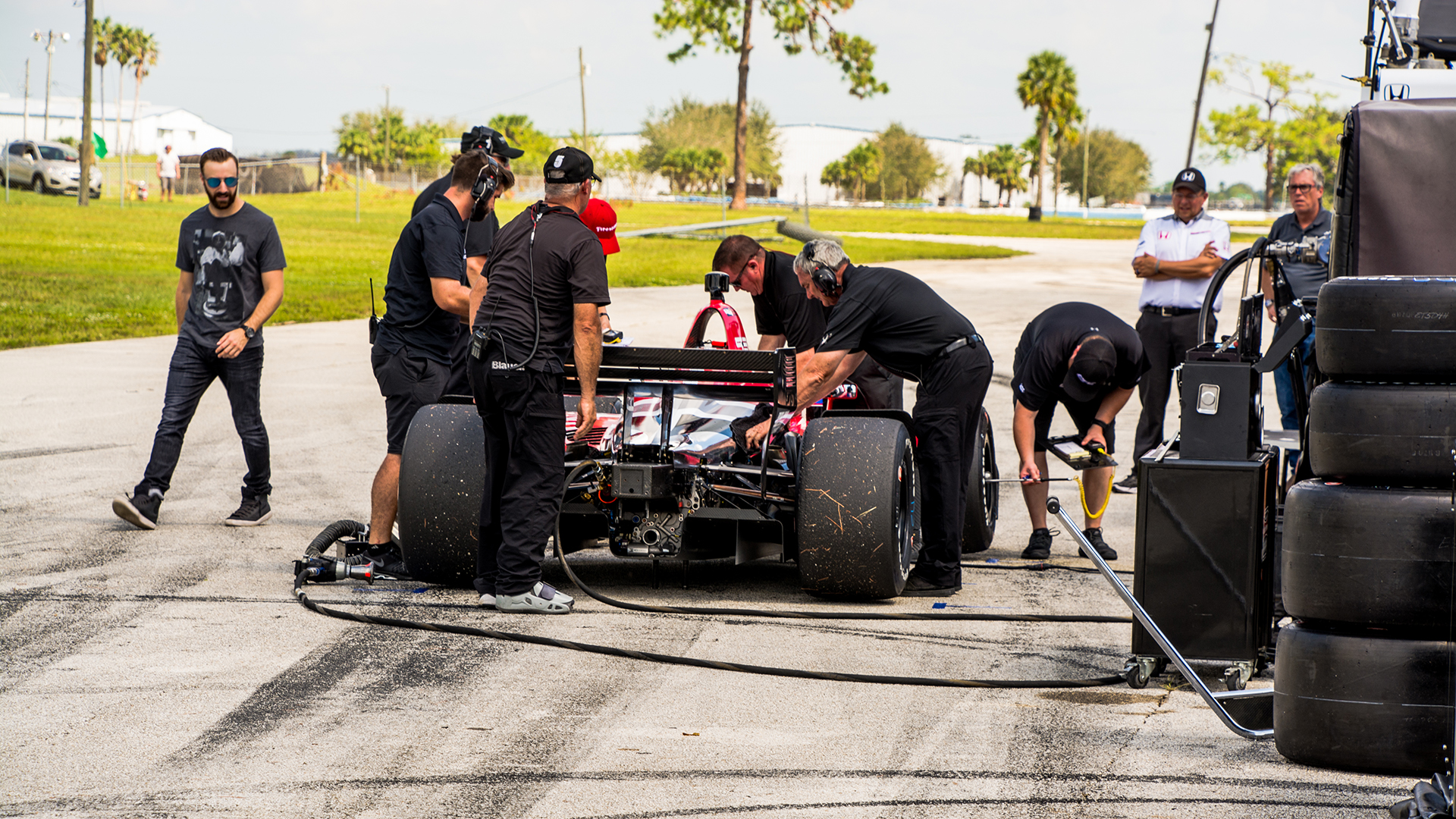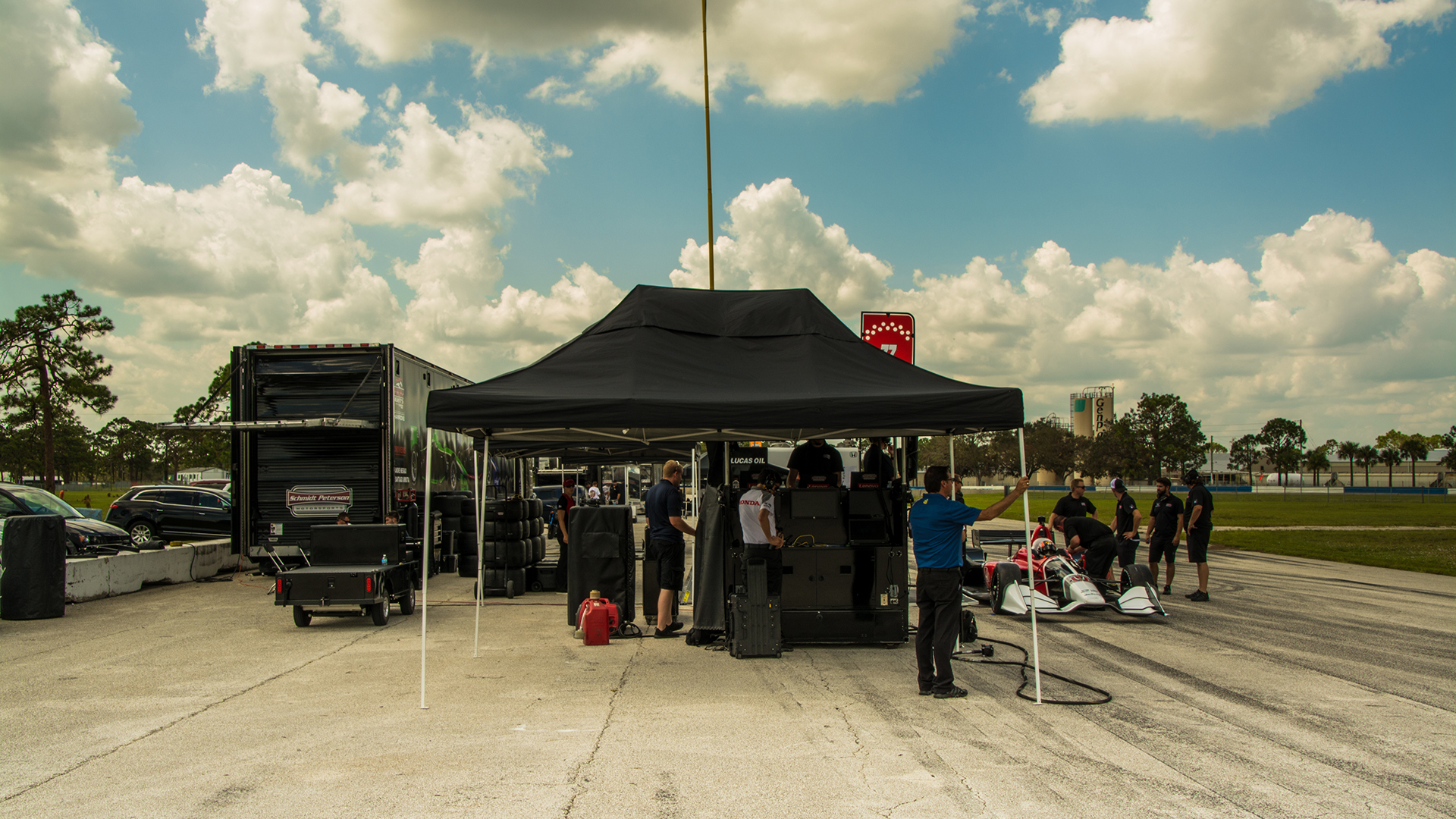 The testing was taking place on the short-track configuration, so the teams were set up at the club pit area in the infield. This meant that the trucks were rolled and make-shift pit areas were assembled on the side of a road. While the drivers and crew had the occasional chance to cool down in one of the mobile offices or transporters that the teams brought, they were, for the most part, outside on a beautiful autumn Florida day. Autumn in Florida means that Summer is just reaching its peak.
