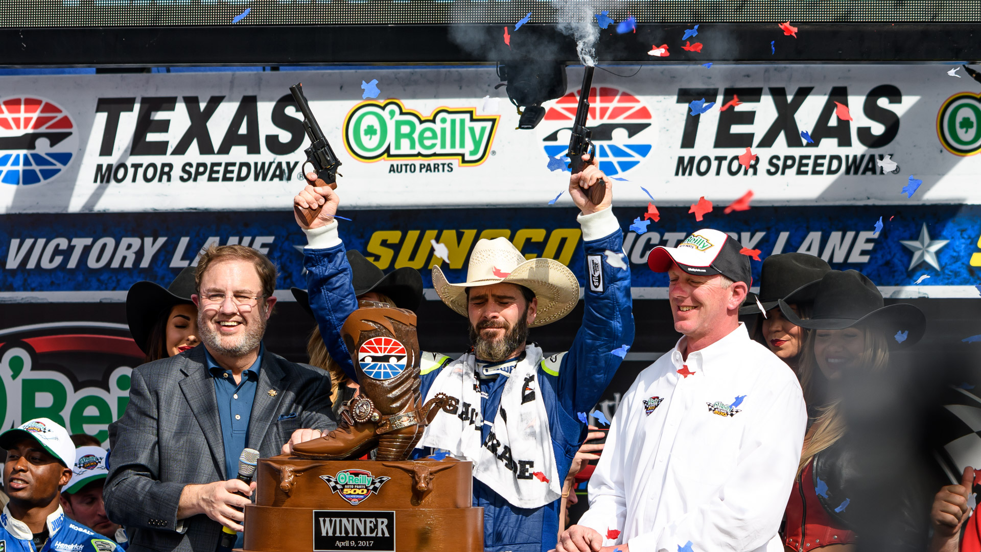 The racing complex’s Victory Lane antics are filled with Texas-inspired commemorations including cowboy hats, flames, and fireworks. A staple of the track entails the race-winner wielding duel handguns and shooting blanks into the sky, though that portion is soon to be nixed according to Texas Motor Speedway President Eddie Gossage.