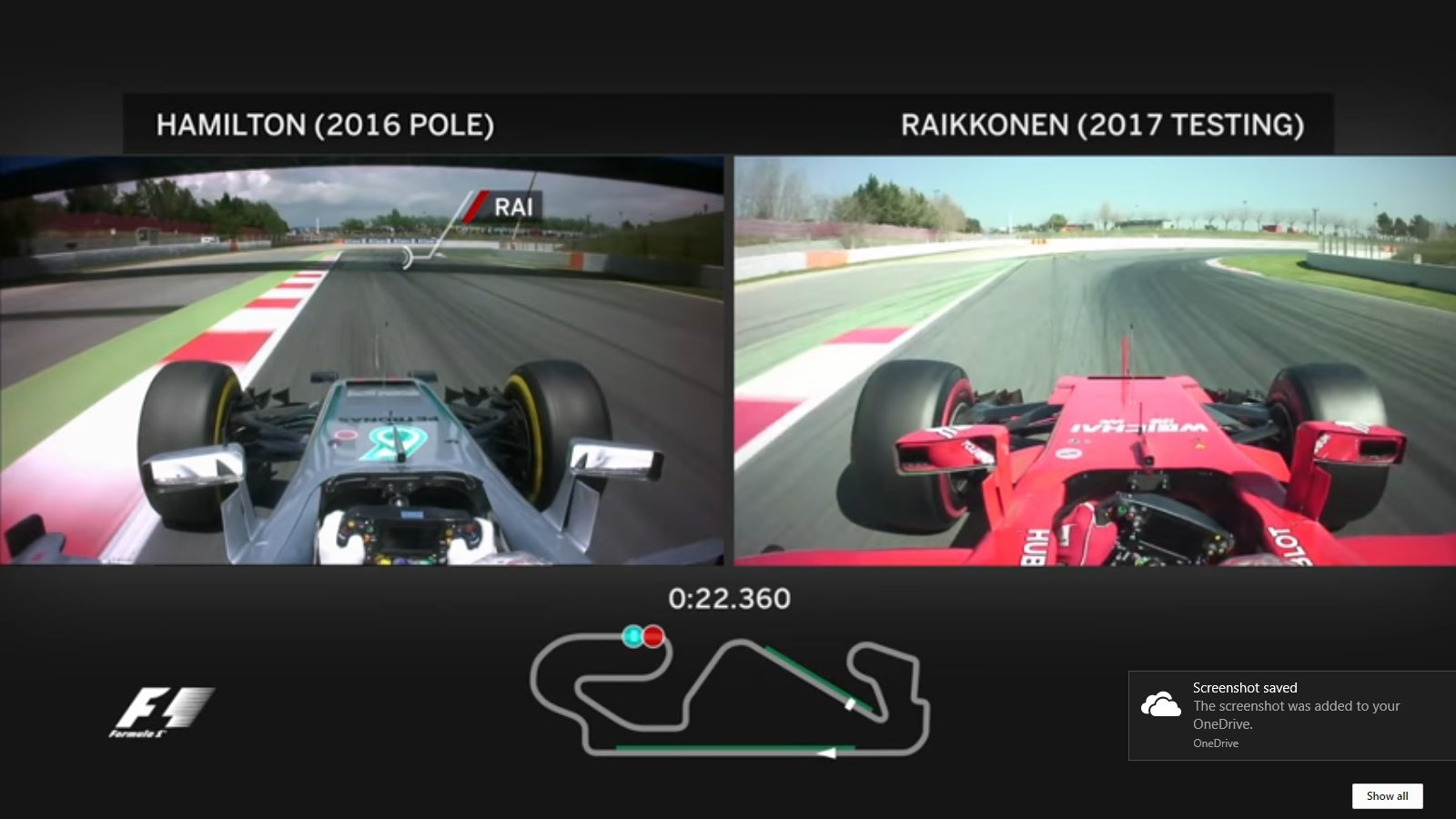 And it’s not as if the two drivers here vary greatly in skill. On the left hand side is Hamilton racing for Mercedes Petronas while the right side features Kimi Raikkonen in the 2017 Ferrari. You can see them racing around Circuit de Catalunya in Barcelona, the track that played host to F1 testing last week. Whereas Hamilton shows good pace, Raikkonen’s car is undoubtedly quicker — this is especially evident when you see the approach to a corner at the 00:28 second mark. Outright speed helped the Ferrari team to achieve big gains in lap times this year, allowing Raikkonen to set a lap record on the 10th of this month in Spain.