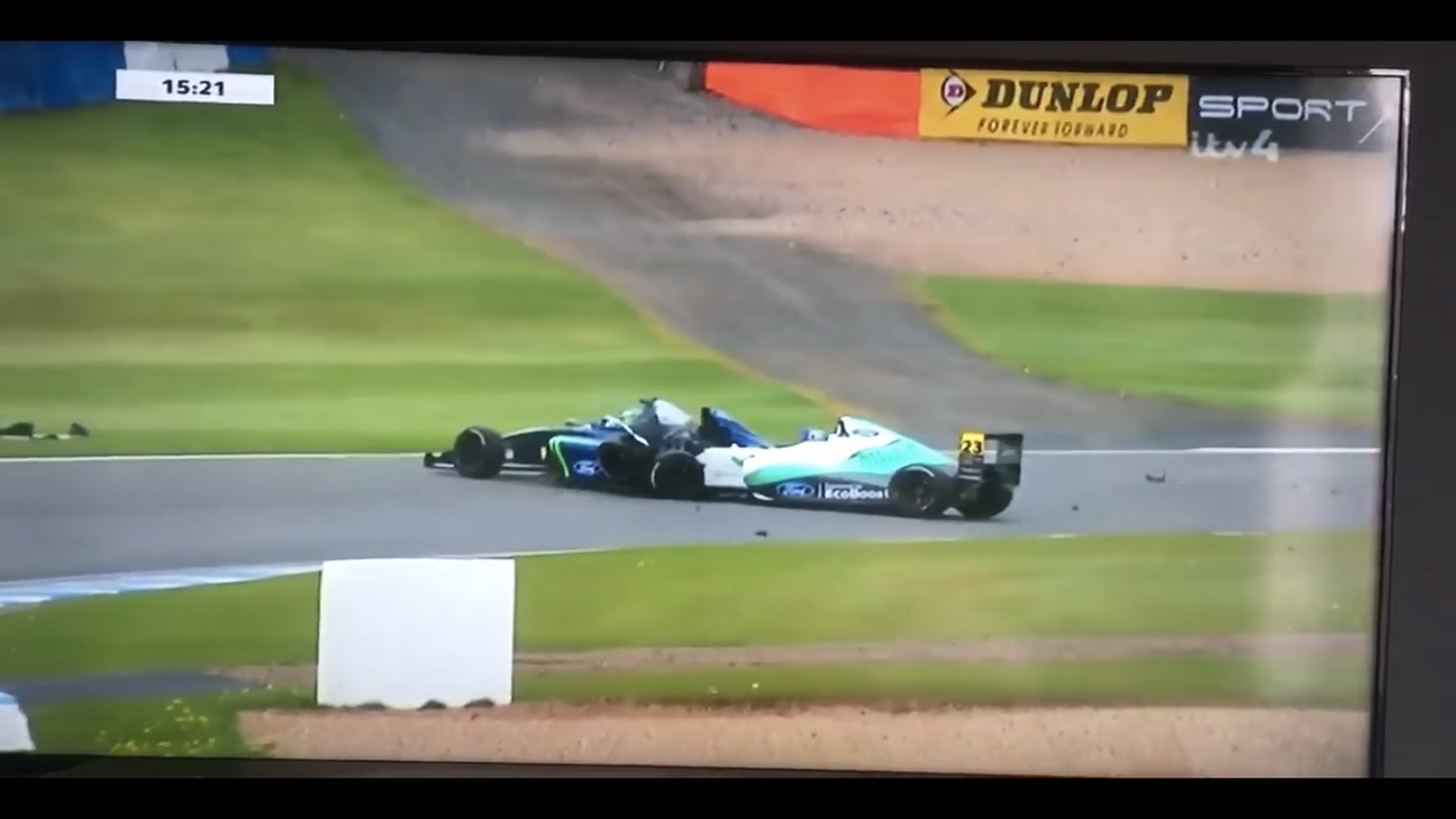 Monger, as you can see in the video, was following a train of fellow racers through Britain’s Donnington Park. As he came around to the right side of the track, you can see the cars ahead of him dive to the side as Pasma’s slowed his car. With little visibility past the cars in front of him, Monger had nearly no time to react and piloted his car right into the back of Pasma’s Carlin car.
