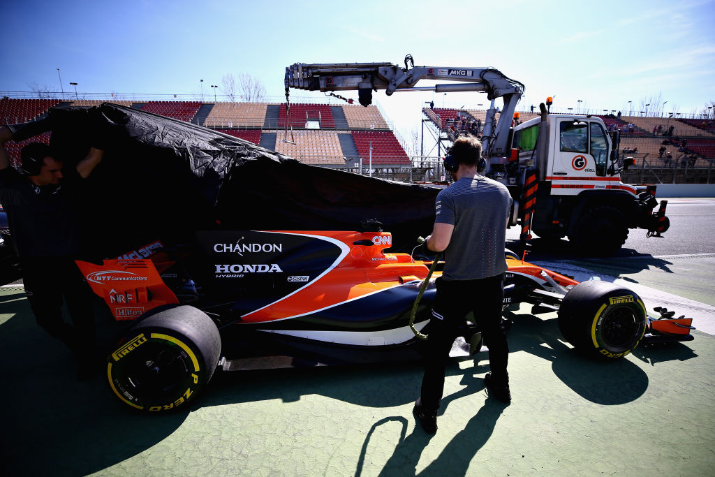 Some hope was rekindled when Honda announced an updated engine would see trials during the in-season testing at Bahrain International Circuit on two weekdays after the Grand Prix weekend. Alas, with one day of testing concluded, some of these newfound hopes have been dashed. The McLaren of Oliver Turvey was called back into the pit lane early when a dangerous water leak near the car’s Energy Recovery System was detected, according to GPUpdate. The energy recovery systems of modern Formula One cars convert excess heat energy generated by the engine and kinetic energy normally lost under braking into electric energy, stored in a high voltage battery. If leaking coolant were to cause a short circuit between part of the ERS system or battery and the car’s highly conductive carbon fiber bodywork, a risky scenario for the driver, pit crew, engineers, and track marshals could occur.