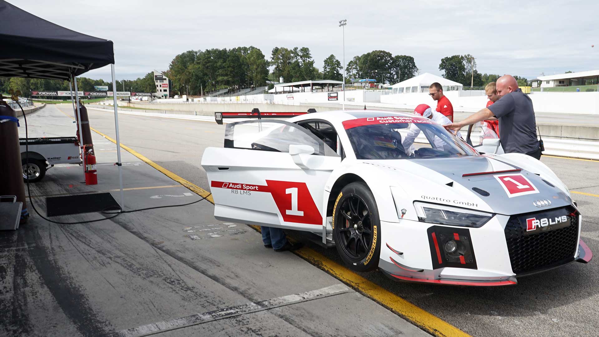 We arrive at Road Atlanta on Tuesday morning under the threat of rain clouds. The grandstands are empty, the grounds littered with trash from the previous weekend’s Petit Le Mans. On pit lane, Audi engineers are busy working on the R8 LMS. It’s a beautiful thing, dressed up in familiar livery. A mere glance gets the engine in your ribcage thumping.