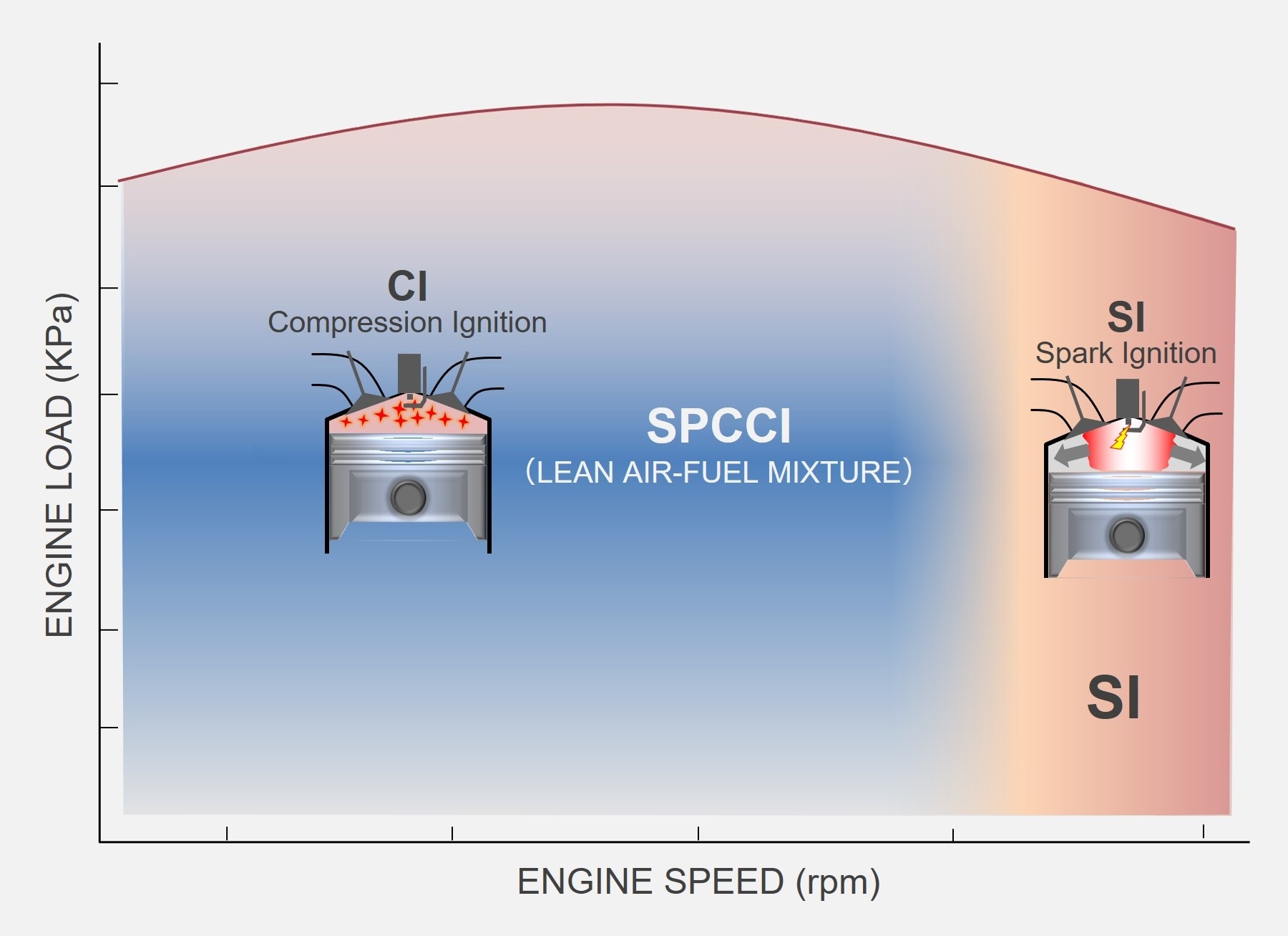 So Mazda came up with a clever hybrid solution: spark-controlled compression ignition, or SPCCI. In SPCCI, the engine is designed to compress the fuel/air mixture to a bit below the threshold where compression ignition would occur (to a 16:1 ratio in the Skyactiv-X engine, specifically), then kick off ignition with a small spark—just enough to ignite a fuel-dense area, creating a tiny fireball…which, in turn, pushes outwards against the rest of the fuel/air mix, raising the pressure to the point of compression ka-blam.
