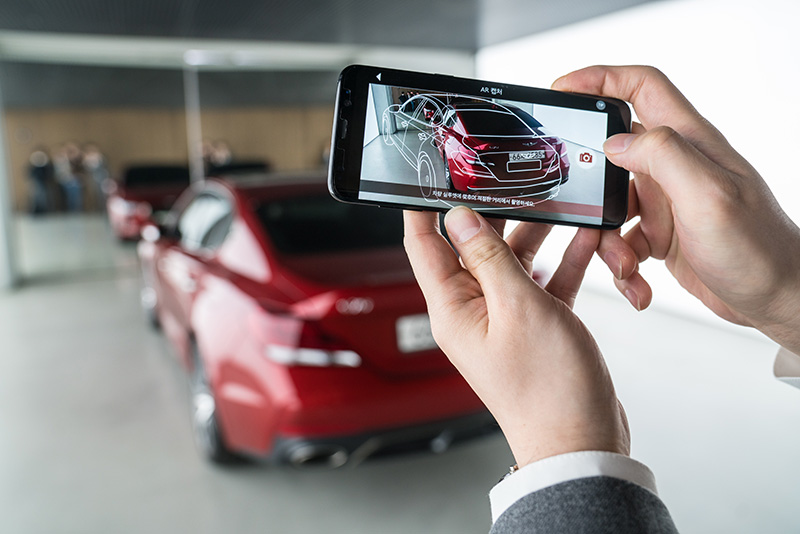 Upstairs, the process repeats with the same models for now, though the cars will vary as SUVs, crossovers, and sports cars flesh out the Genesis lineup. In the back, there’s a spartan launch pad for test drives, with your chosen model presented in a garage-like space behind a set of mirrored doors that open up to release you onto one of several different test-drive routes around Seoul. If you like, you can play with an augmented-reality app that lets you explore your car, access the owner’s manual, and figure out where the oil dipstick is.