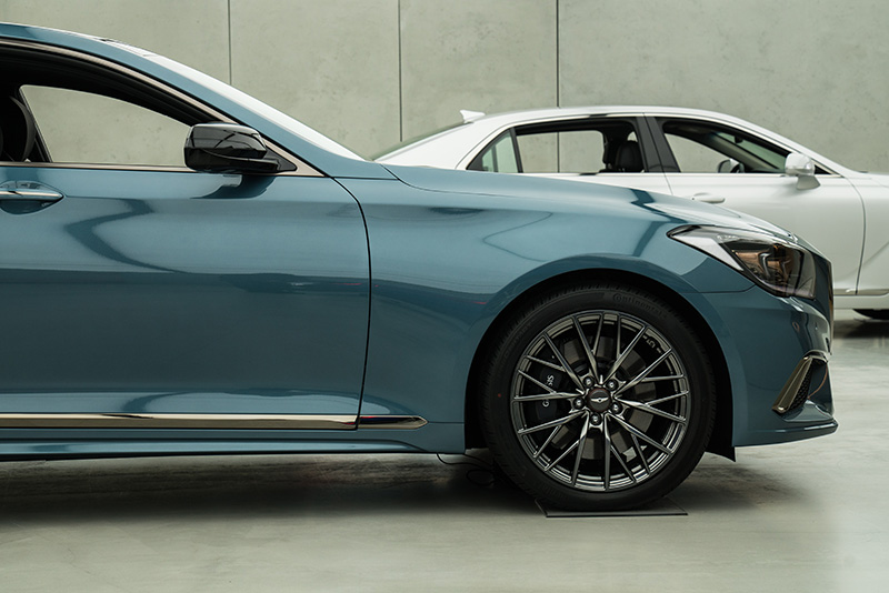 It makes that introduction with all due discretion, barely even registering as an automotive presence from the street. There’s a logo on the façade and glimpses of vehicles—a fender here, a taillight there—peeking out between the severe concrete walls that divide up the interior space. Inside sits a selection of the brand’s three current models—the G90 (a.k.a EQ900 in Korea), the G80, and the G70, the latter of which will arrive in the U.S. this year. Samples of leather and paint hang tastefully in a nook, and a few sly phrases etched in stone convey the brand’s gestalt.