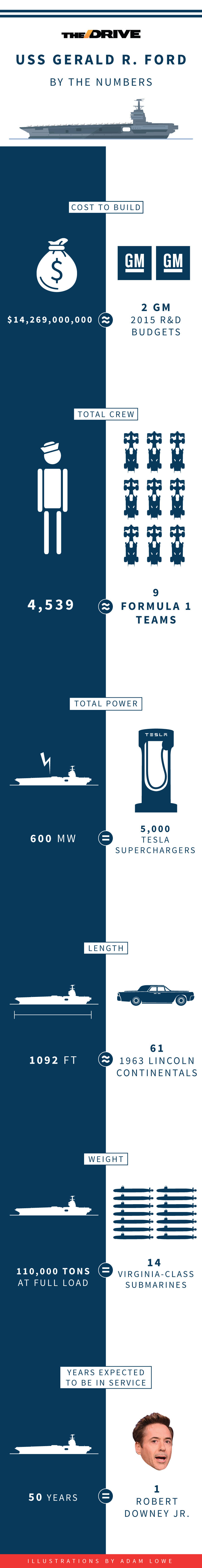 Later this year, for the first time in more than four decades, the United States Navy will enter a new class of aircraft carrier into service. The USS Gerald R. Ford, named for America’s first model-slash-president, is a thoroughly modern carrier through and through. She’s the first American ship to use an electromagnetic catapult to launch airplanes. The first to feature stealth features. The first to use a new class of nuclear reactor capable of powering laser cannons and deflector shields.