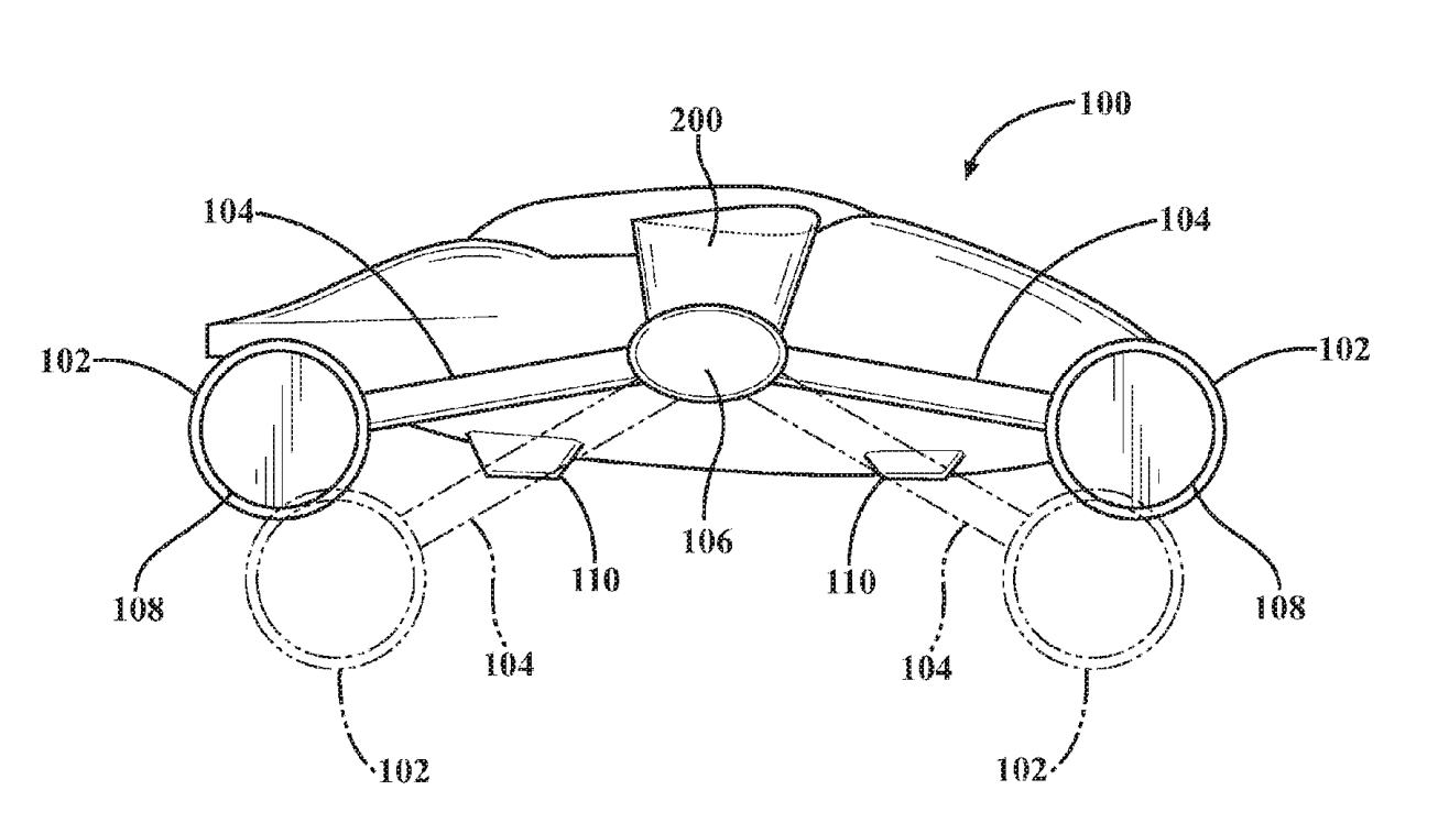 We’ve seen quite a few “flying car” concepts in recent years, with most of them either going for a fixed-wing approach or opting for a quadcopter passenger drone design. This application by Toyota, however, describes a vehicle whose wheels are part of arms attached to a central pivot. In other words, when it’s time to take to the skies, these arms would shift the wheels around and let the rotors out in order to take off.