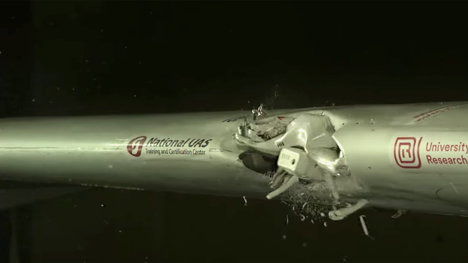 “While the quadcopter broke apart, its energy and mass hung together to create significant damage to the wing,” Poormon said.