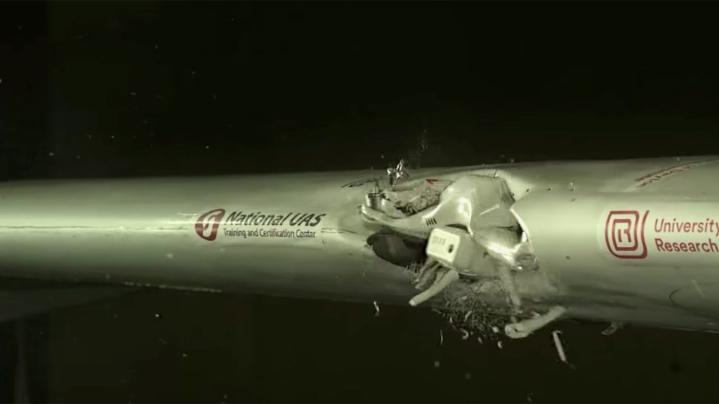 In the original blog post, the University of Dayton researchers explain that the test was designed to “mimic a midair collision of a drone and a commercial transport aircraft at 238 miles per hour.” The testing group—part of UDRI’s Impact Physics division—routinely conducts impact test for various commercial, private, and industrial entities, predominantly in the realm of aviation. As the video shows, the drone tore open the leading edge of the wing and drove into the structure, apparently damaging its main spar—the structural element that supports the wings and attaches them to the fuselage—though that damage isn’t shown.
