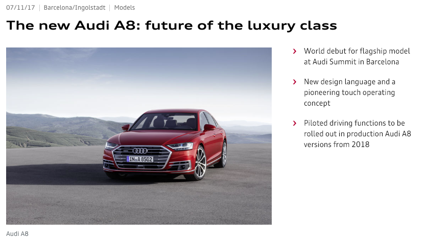 , L3 semi-automated driving in 2018? Not so much., Audi4. Audi Highway Pilot Delayed — Again, I love Audi. I’ve owned a lot of Audis. I really want Audi to succeed, and I don’t feel that way about everyone. But…did someone say L3 semi-automated driving will be here in 2018? It depends on how one reads Audi’s official press release from 7/11/17: