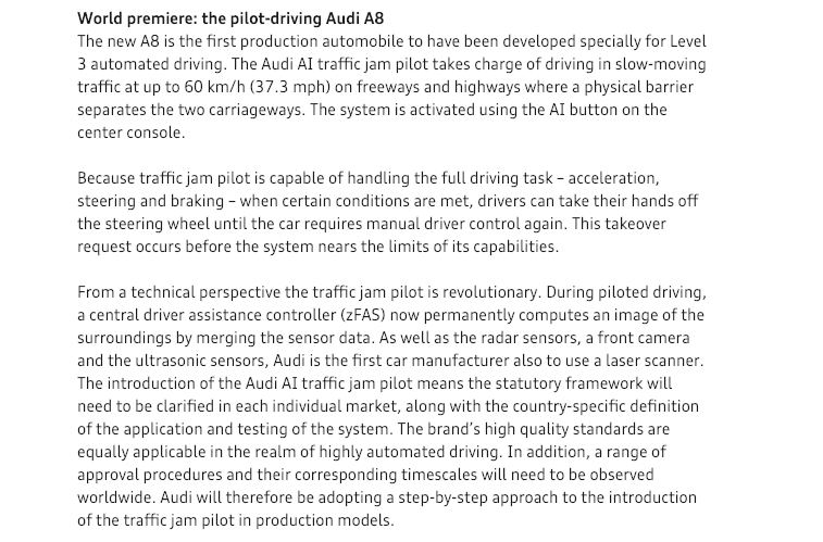 , That’s a lot of words. They forgot the word “will likely be delayed”., Auditranslated that to mean Audi will release an L3 system in 2018. I’ve been saying for two years that NO ONE can or will release an L3 system until someone develops and deploys a real Transition Warning System. I’ve yet to see one. The Cadillac SuperCruise system is decent, Tesla’s is mediocre, and everyone else’s is garbage except for George Hotz’s brilliant Comma.AI system, which is aftermarket only. What happened to Audi’s “piloted-driving”? Audi claims “a quagmire of legal, infrastructural and consumer issues” in the United States. Guess why those issues exist? The system isn’t ready, or it lacks a transition warning system, or the very concept of L3 is flawed. Lame or suboptimal? Why not both?