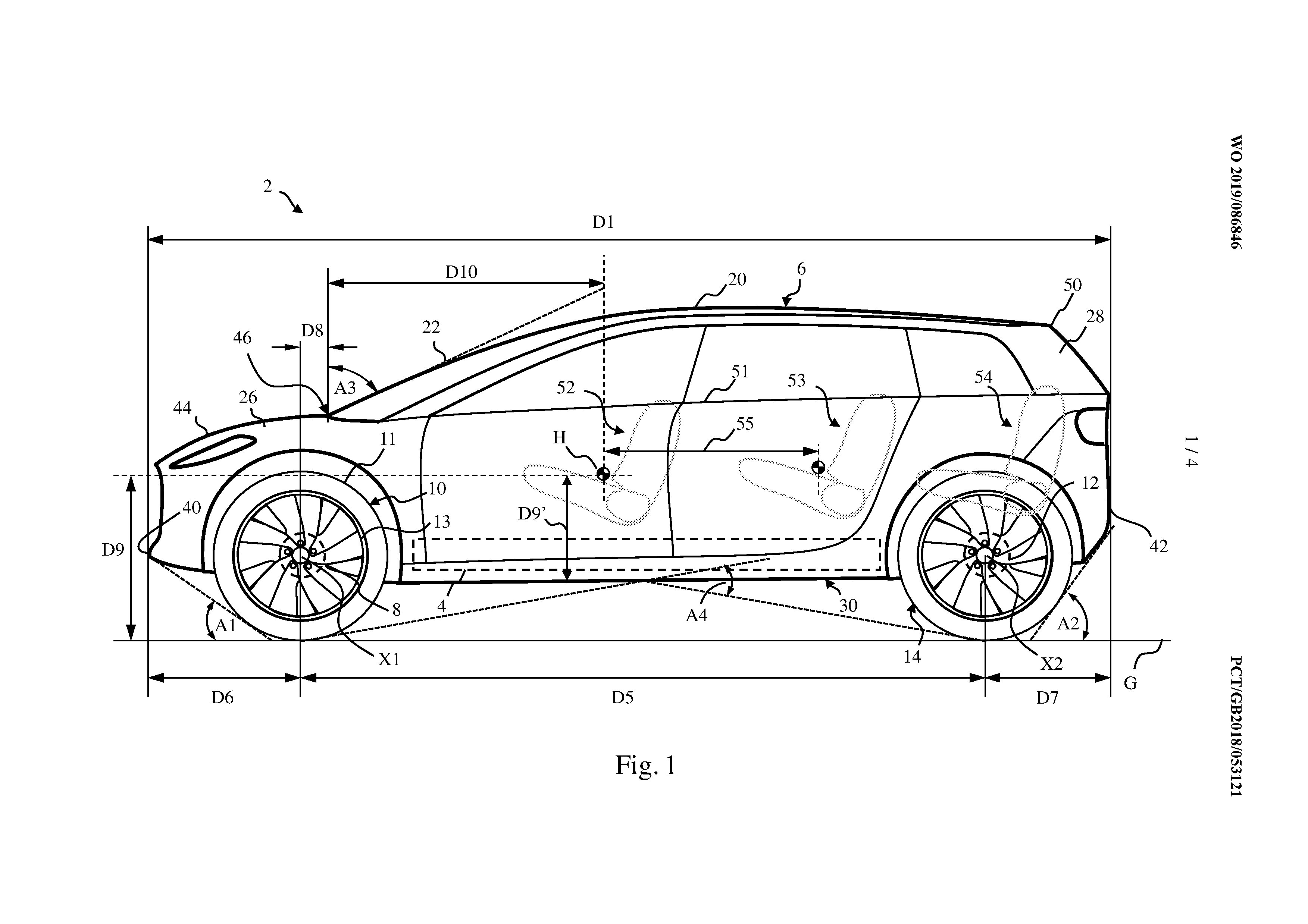 Dyson filed two patents this week describing its new electric vehicle, one relating to its windscreen angle of between 25 and 30 degrees and another relating to its wheels having an outer diameter of between 45% and 55% of the overall vehicle height. The patents describe the vehicle’s relatively high ground clearance and corresponding advantages on rough terrain and in terms of visibility, but note that Dyson’s vehicle combines these advantages with a relatively short overall height which lowers the center of gravity and improves aerodynamics. Aero performance is further improved by the relatively shallow windshield angle, while off-road performance and visibility are improved by its short overhangs. Dyson argues that the performance and ride issues traditionally raised by large wheels can be overcome in an electric vehicle, and that its design results in a vehicle that is far narrower than a traditional SUV.
