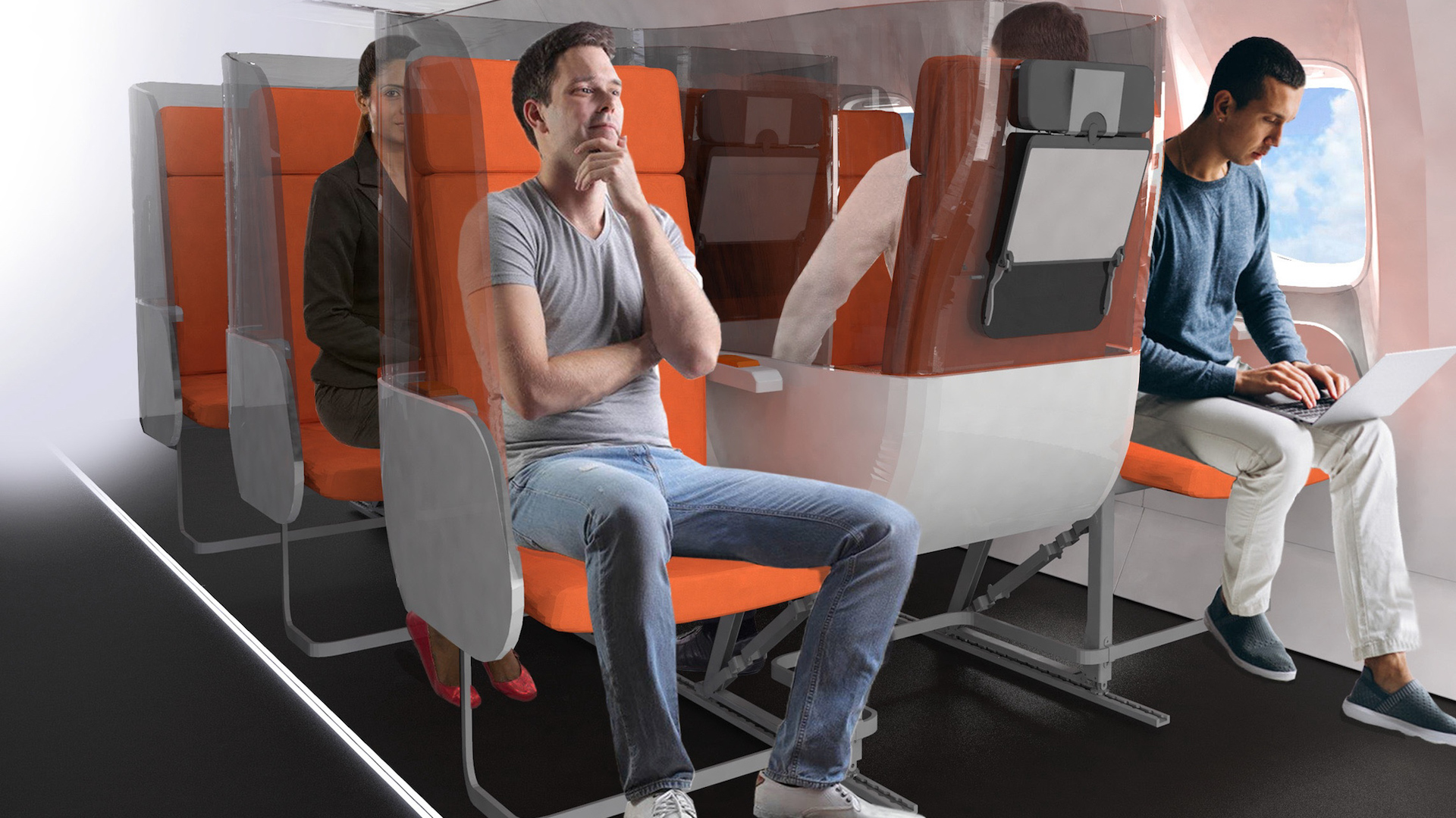 The company released renderings of two new concepts that it says provide a protective barrier between passengers. The first image is of the “Glassafe” partition, which can be installed between existing airline seats. It appears innocent enough and should be a cost-effective way to add a layer of protection between passengers.