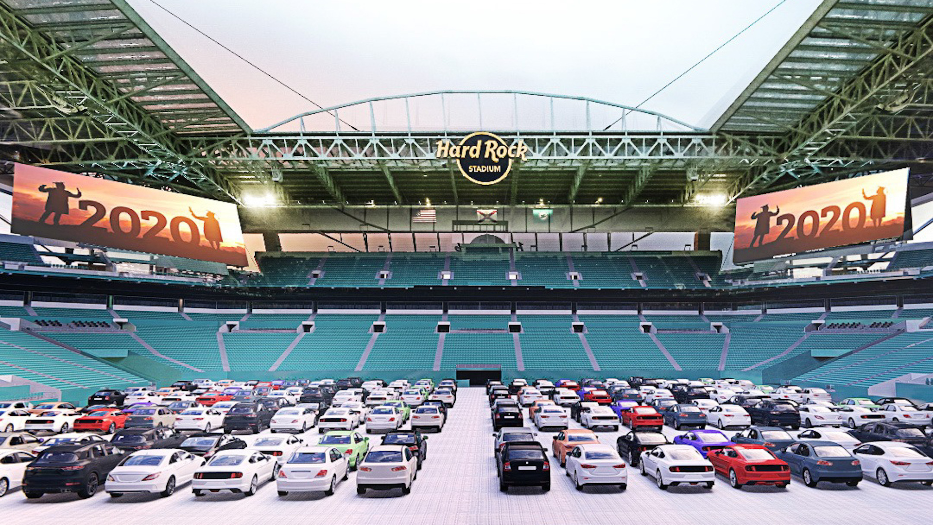 The team will repurpose four enormous displays that were installed during a recent renovation to feature historic Dolphins games, classic films, concerts, and may even be used for virtual commencement ceremonies and other events. Food and beverage will be available with online ordering and can be delivered to the cars on the stadium floor. Hard Rock can hold over 65,000 fans, but only 230 vehicles will be able to park on the venue’s floor, parked in several rows facing the screens. It’s unclear how the logistics of getting people in and out will work, or if there will be limitations on the size and type of vehicle that will be allowed in the venue, but it’s hard to imagine that being parked behind a bro-dozer will make for a good viewing experience.