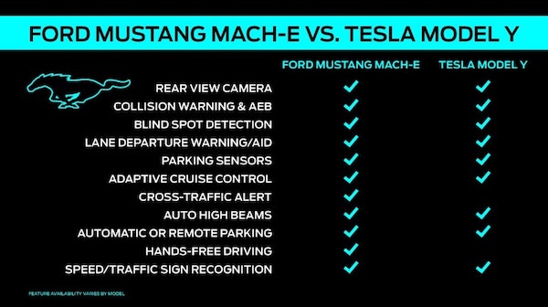 The Blue Oval is more than eager to draw further comparisons between itself and Tesla, as shown by the below infographic comparing the safety systems of its Mach-E to Tesla’s reportedly production quality-plagued Model Y. It will soon face comparison to additional players in the automated driving assist field, though, as GM’s Super Cruise is set to evolve into city-compatible Ultra Cruise, and BMW is also set to join the fray, though the maturity of its driving-aid technologies remains unknown.