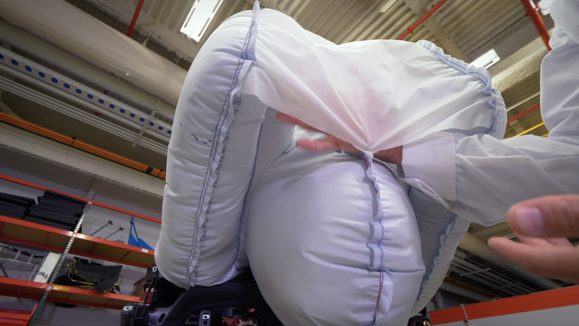An uninflated “sail” panel connects the tops of the two taller cushions, which helps the airbag’s tall bolstering cushions stay where they need to be as the passenger’s body moves forward. These two taller cushions guide the passenger’s body into the airbag itself.