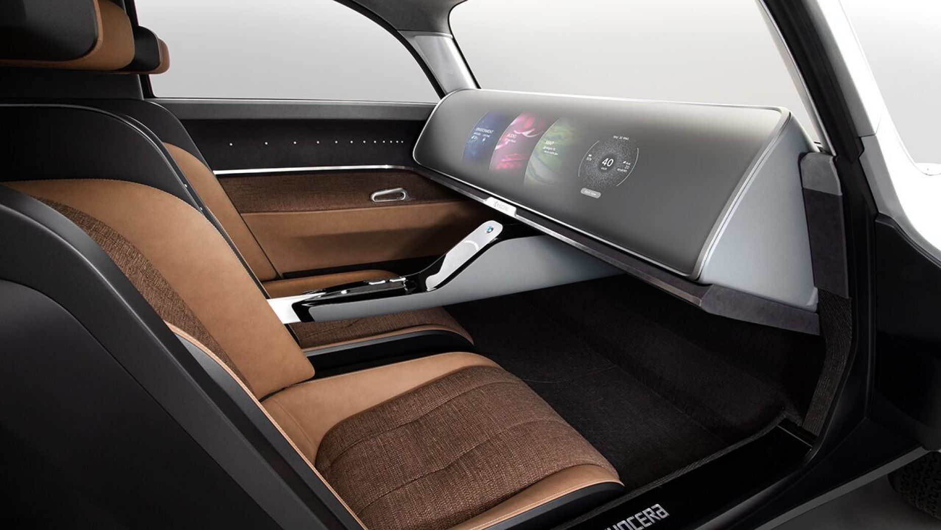 Kyocera calls this “optical camouflage technology.” It projects whatever is in front of the car onto the large display that fills the dashboard, as well as the A-pillars which are otherwise used for the car’s camera-based mirrors. The combination makes the cabin feel infinitely open facing forward, almost like you’re touching the road. When not in use, the display acts as the car’s central control panel, allowing access to vehicle information, in-car audio and navigation, which is how Kyocera seemingly envisions the car to be controlled.