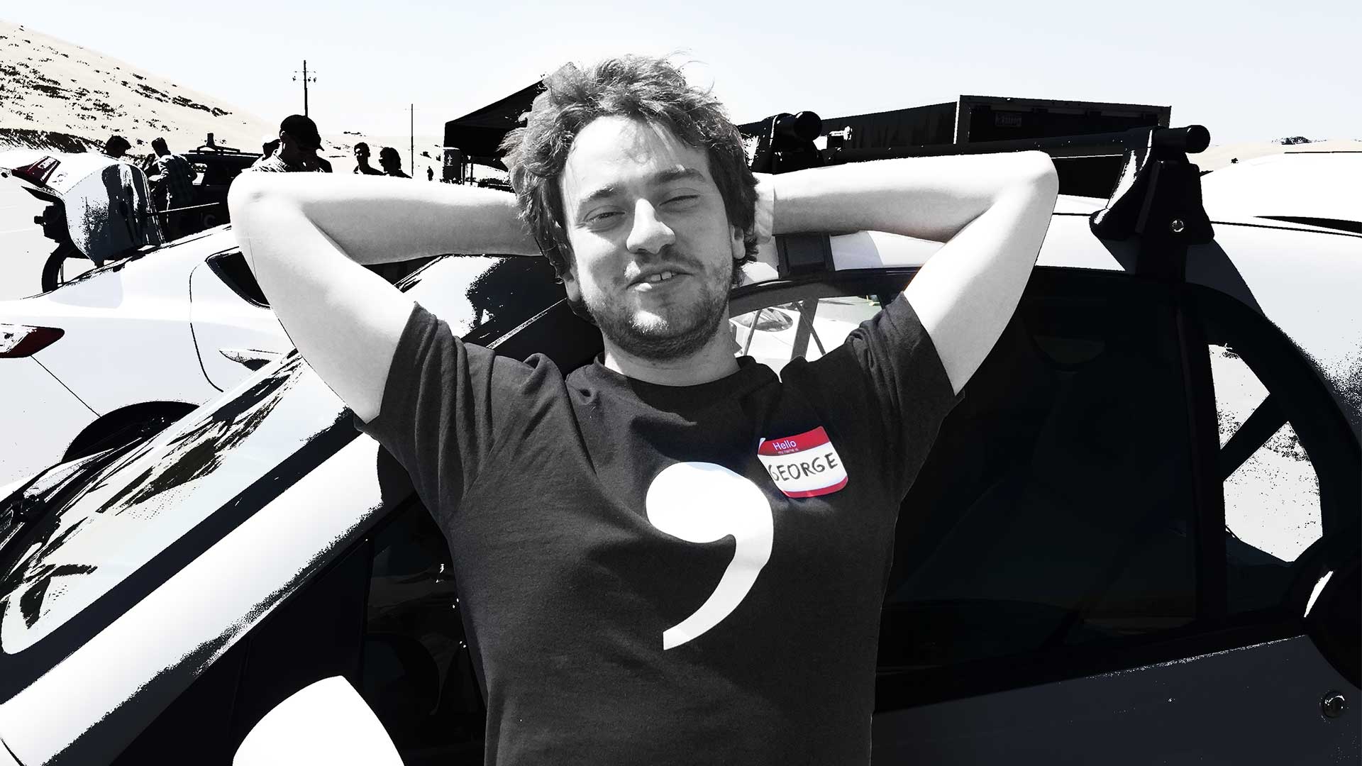 I wasn’t nervous. I was sick—ill with excitement and anticipation and too many Blueberry Clif bars dug out of someone’s trunk. My smoked-out sunglasses were streaked with the same sweat dripping into my eyes from my helmet’s damp foam liner, the sweat of whomever had lent me their Medium instead of the XL I needed. I could barely see. It was ninety degrees in the sun, one hundred inside George Hotz’s dusty white Acura ILX, and I didn’t care.