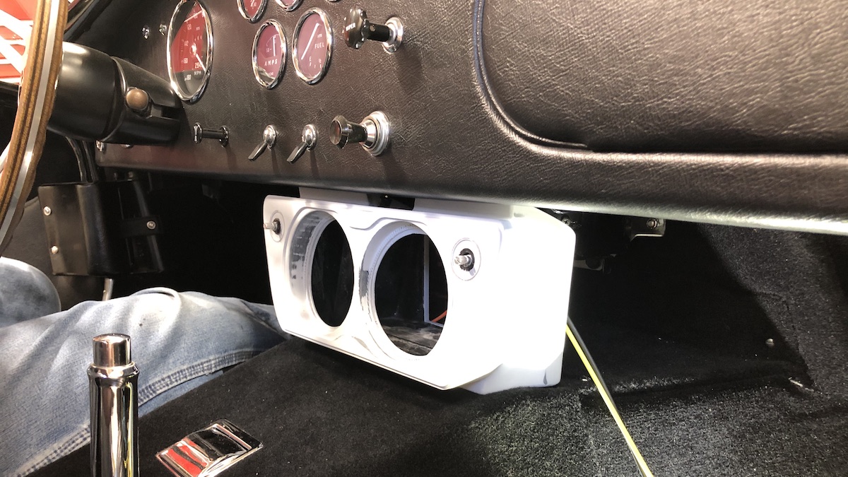 The unit, which looks like something turned out by a modern electronics factory, connects to the car’s electrical system by a pair of plugs. With a push, it secures under the Cobra’s dash, a temporary system that looks permanent, with an outward design that reads as period-correct to the ’67 Cobra as an IBM Selectric typewriter from one of the office scenes in Mad Men.