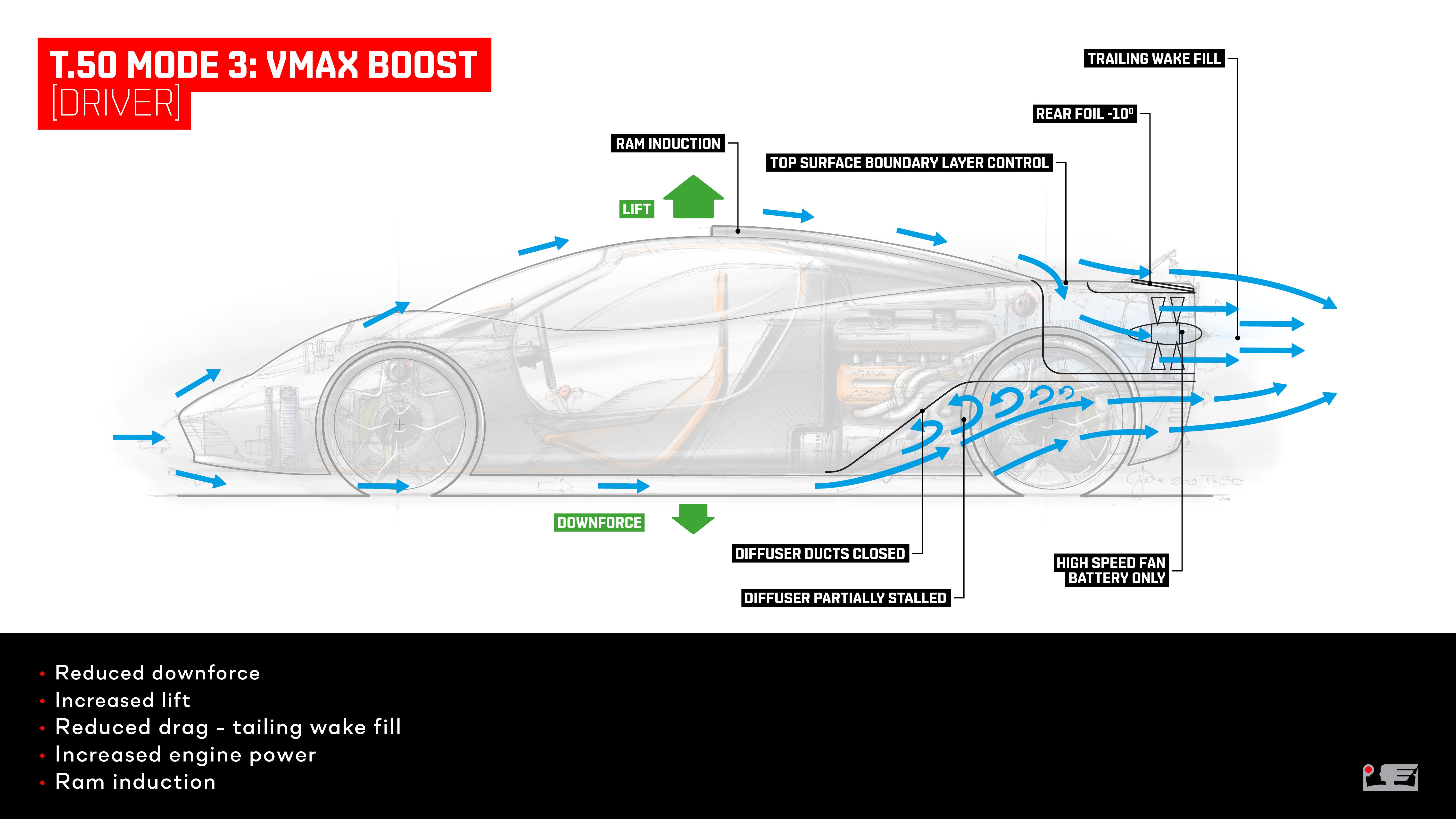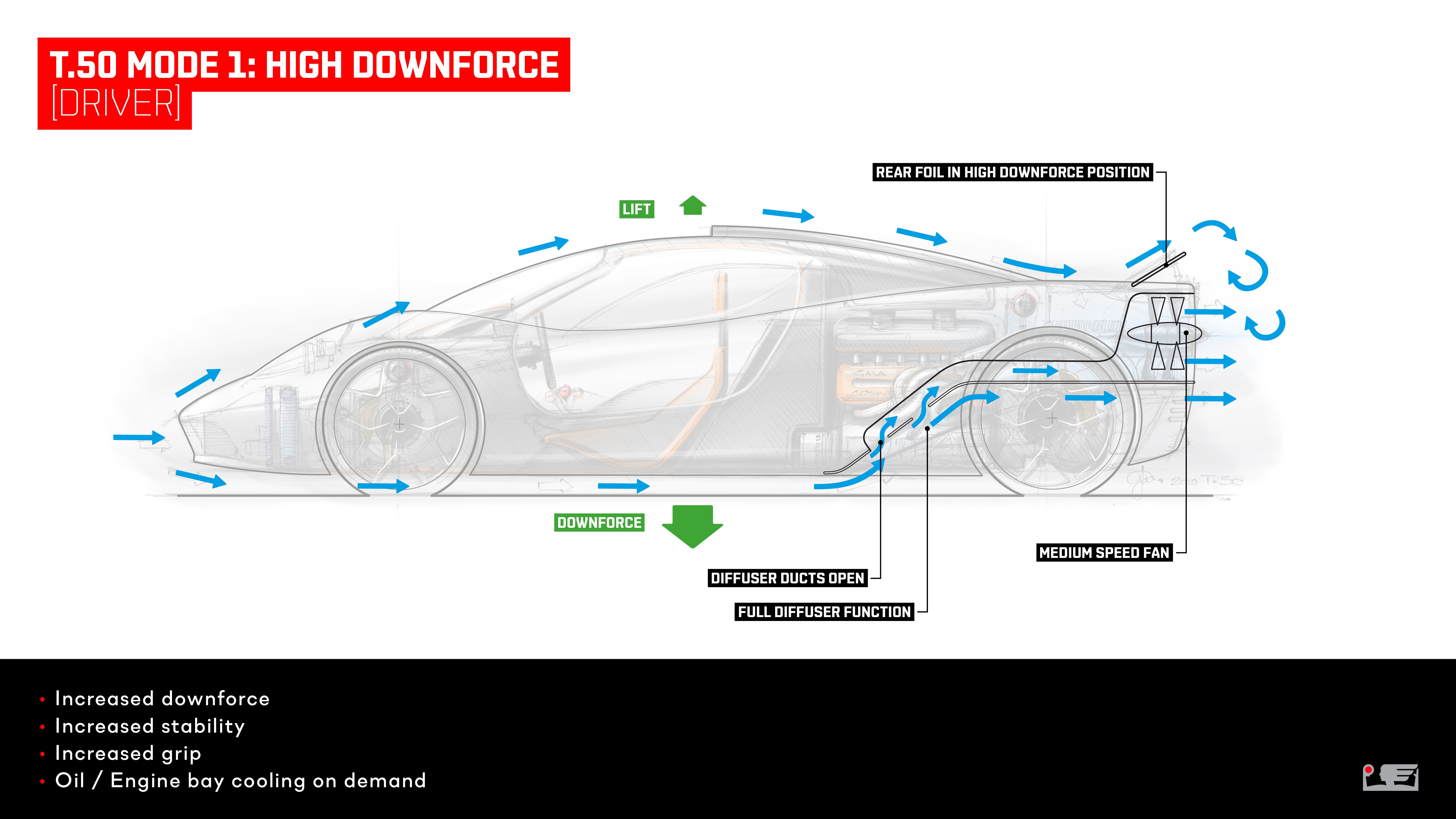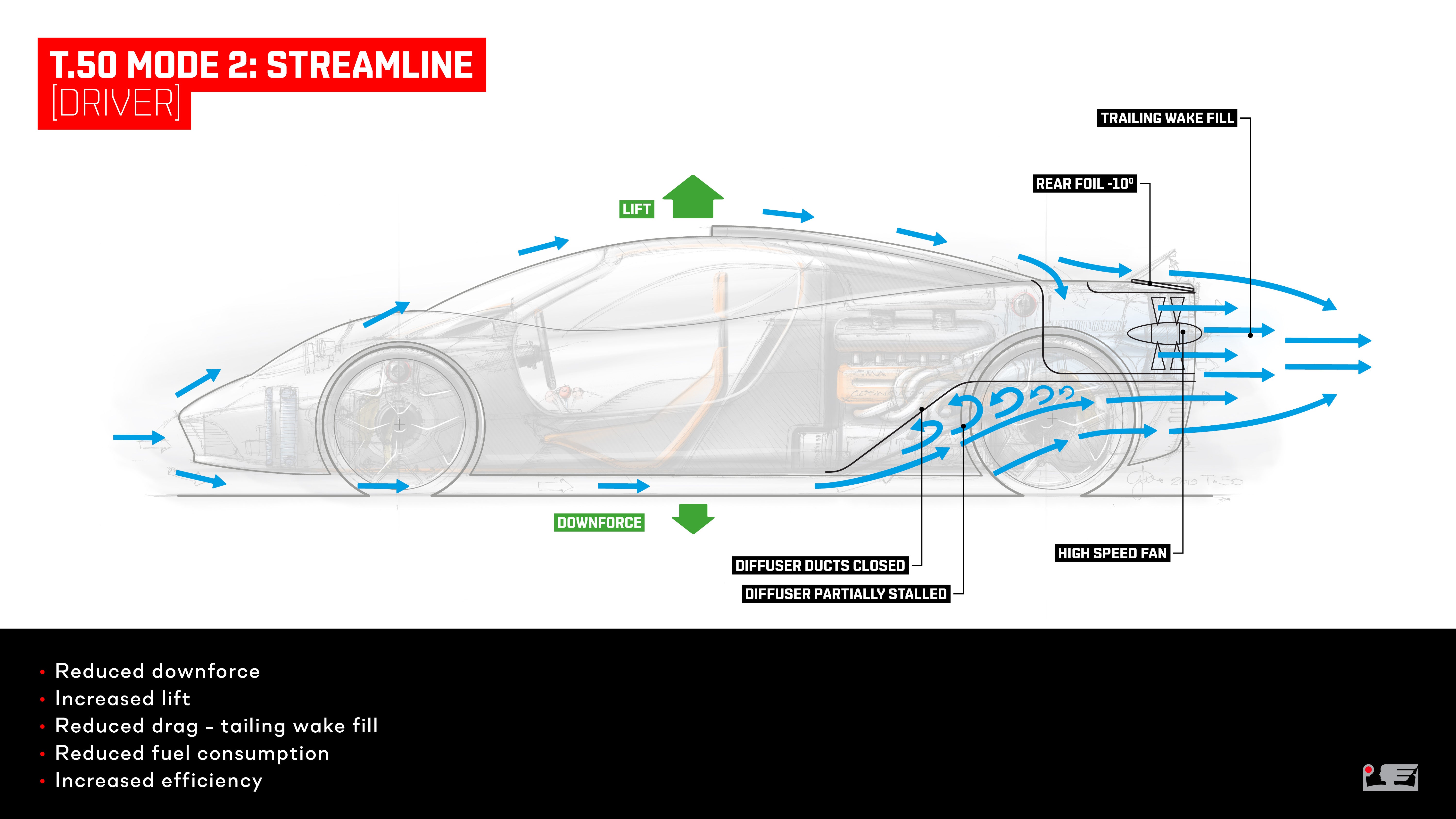 As Professor Murray explains, seal up the rear of a car and you get a vacuum cleaner you wouldn’t want to drive behind. However, choose the T.50’s “most funky” mode called Streamline, which uses the combination of three elements—the fan, the rear wings and the diffuser flaps—to reduce drag by 12.5 percent.