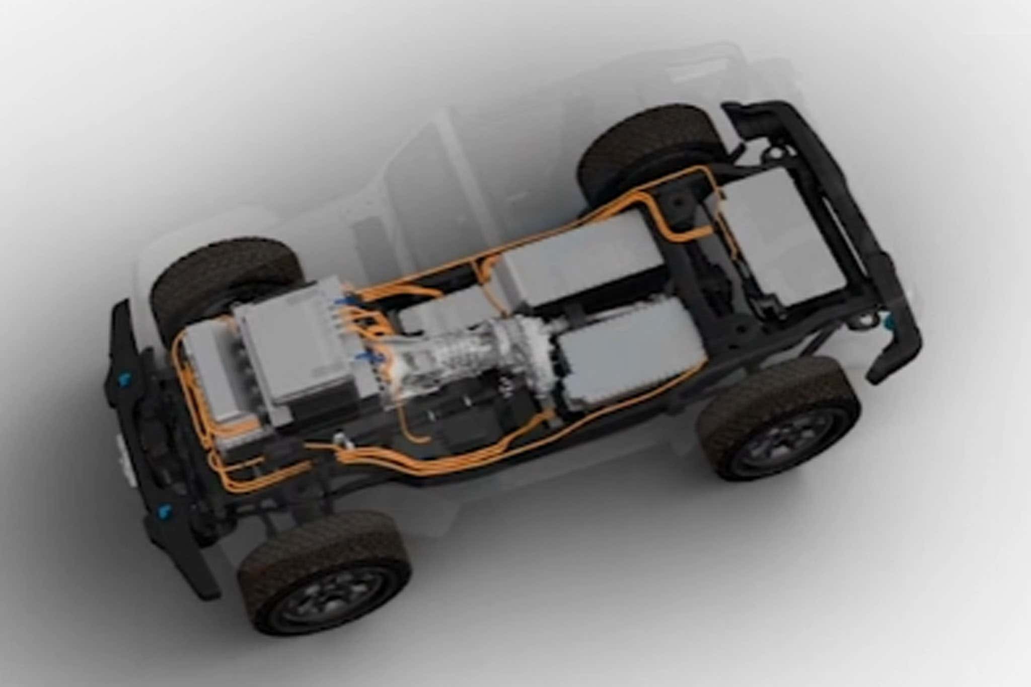 By the sounds of it, the Wrangler Magneto was the most difficult of the bunch to build for 2021’s wheeling trip to Moab. Rather than swapping in a Hemi V8 and calling it good, the engineering team responsible incorporated a four-battery electric drivetrain that ditches the more traditional “eAxle” setup. Whereas you’d expect to find electric motors at the front and rear, there’s a single axial flux unit under the hood in place of the engine. It spins up to 6,000 rpm and sends power to all four wheels via a method we’re used to seeing on traditional ICE cars.