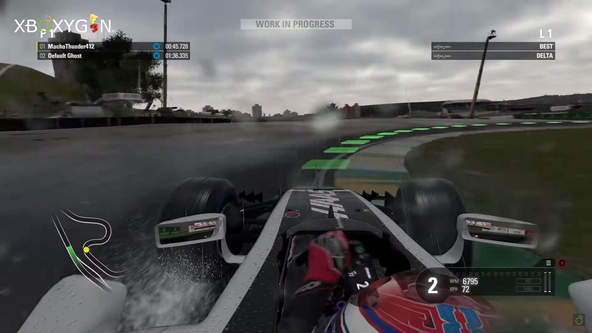 A smattering of changes jump out right away. Namely in the overhauled HUD cluster, which now has a steering-wheel-style digital tach, plus a handy distance meter for when you’re closing in on DRS zones. But the biggest deal? That wet weather clip.