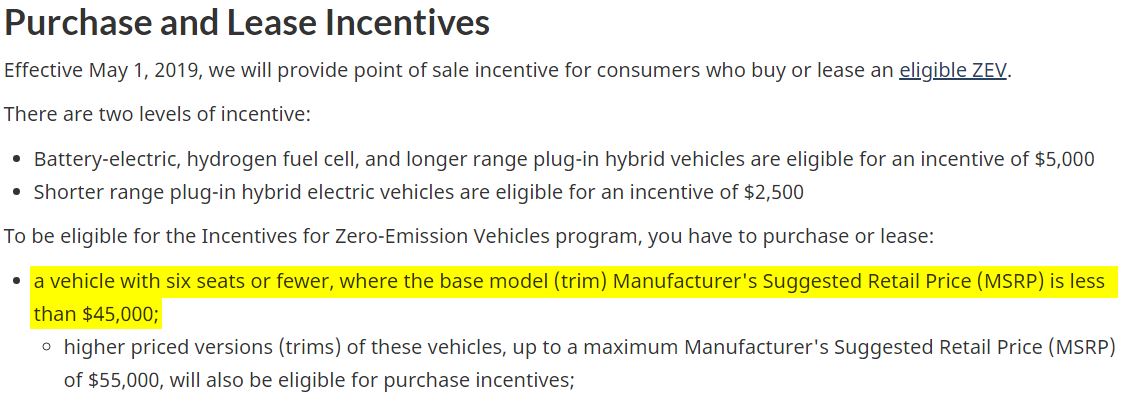 Canada’s system is quite different than the United States’ approach to a $7,500 post-sale federal tax credit. Essentially, the arrangement is a $5,000 credit used towards the purchase of a qualifying electric vehicle which is applied at the time of purchase—or a lesser amount if the vehicle is a plug-in hybrid or leased instead of purchased. Automakers submit an application to Canada’s department of motor vehicles, called Transport Canada, for specific models to be considered for the iZEV program. Once the model is approved, buyers can begin utilizing the incentive at the time of purchase to reduce their out-of-pocket expenses.