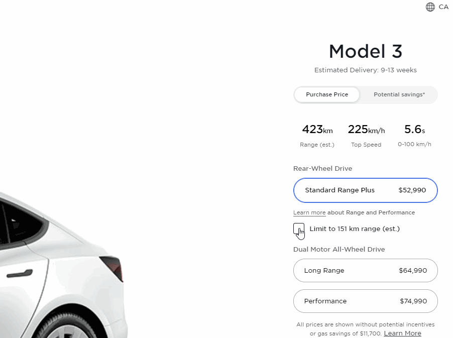 Tesla charges $52,990 for the Model 3 Standard Range Plus, however, buyers can opt to limit the vehicles to 94 miles (151 km) of range which drops the price down to $46,389. If you remove the $1,280 destination fee, the $100 air conditioning fee, and a $10 fee to the Ontario Motor Vehicle Industry Council, it brings the purchase price of the Model 3 SR+ to just $44,999—one dollar below the cut-off to qualify for the iZEV credit.