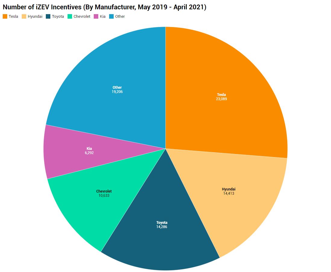 In total, the iZEV program has paid out 87,919 total incentives, 26 percent of which have gone towards Tesla Model 3s—more than Audi, BMW, Chrysler, Ford, Honda, Mini, Mitsubishi, Nissan, Smart, Subaru, and Volkswagen combined. The automaker which had the vehicles with the second-highest number of incentives is Hyundai at 14,413, however, that number is split between six different models, three of which are plug-in hybrid which only receive half of the $5,000 BEV incentive.