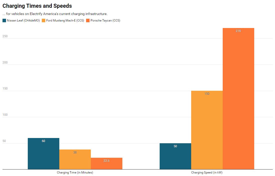 A Nissan Leaf equipped with a 62-kilowatt-hour pack will take approximately an hour to charge from 10 to 80 percent, netting roughly 180 miles of range. The extended range Mustang Mach-E will get around the same range with its larger 88-kWh pack, but that charge time is dropped to around 38 minutes due to its faster 150-kW charging speed. Then there are gems like the Porsche Taycan, which currently supports a charge rate of 270kW and hits 80 percent in around 22.5 minutes. Porsche has previously said that the Taycan will eventually utilize EA’s full-speed 350kW charging in the future, meaning even faster charging.