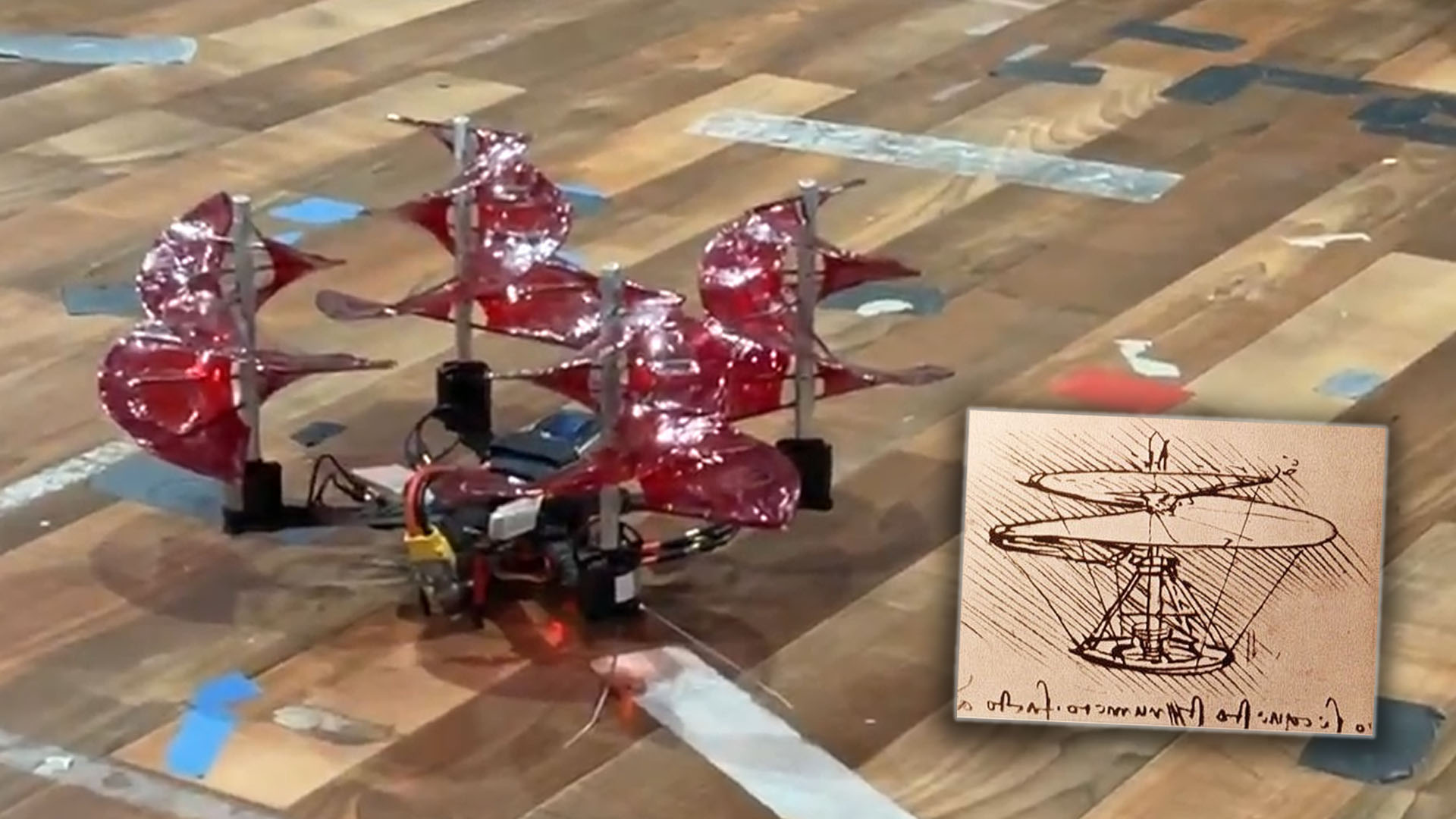 Assembled for a student design competition hosted by the Vertical Flight Society, it’s a mixture of old and new. With rotors reminiscent of Leonardo DaVinci’s aerial screw illustrations from the late 1490s, it flies like any other drone would, all while looking extremely bizarre and having interesting flight characteristics.