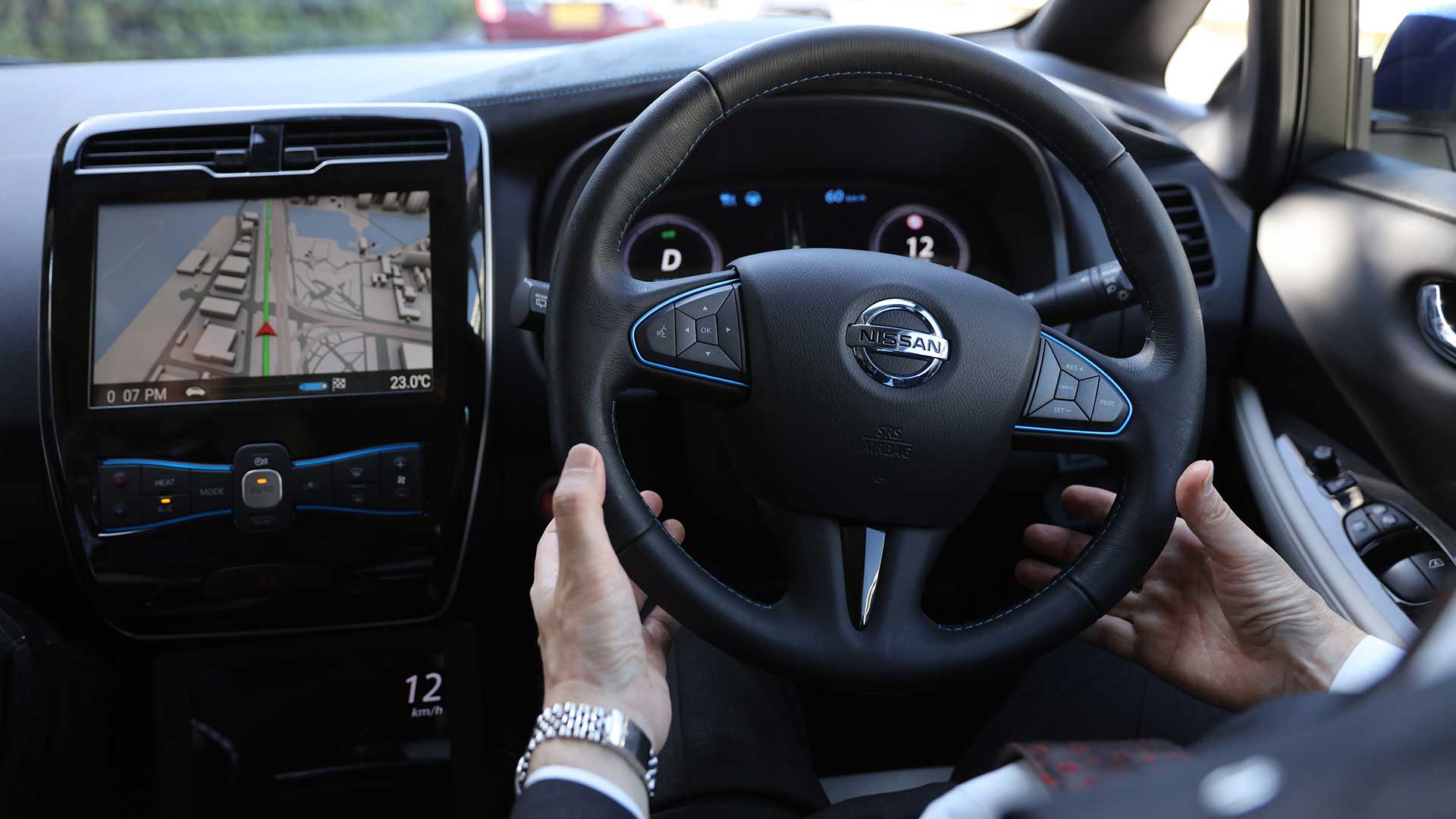 We’re told that in the case of a car stopped ahead with flashing hazard lights, the autonomous Leaf would come to a stop. In case of an accident blocking the lane, the current system would perform a safe panic stop, though future iterations may include accident avoidance through lane change. In inclement weather, when sensors are degraded by snow or rain buildup, the system would make a “takeover request” to the driver. If the driver didn’t respond, it would engage “Safe Mode” and pull over to the shoulder until the driver took control.