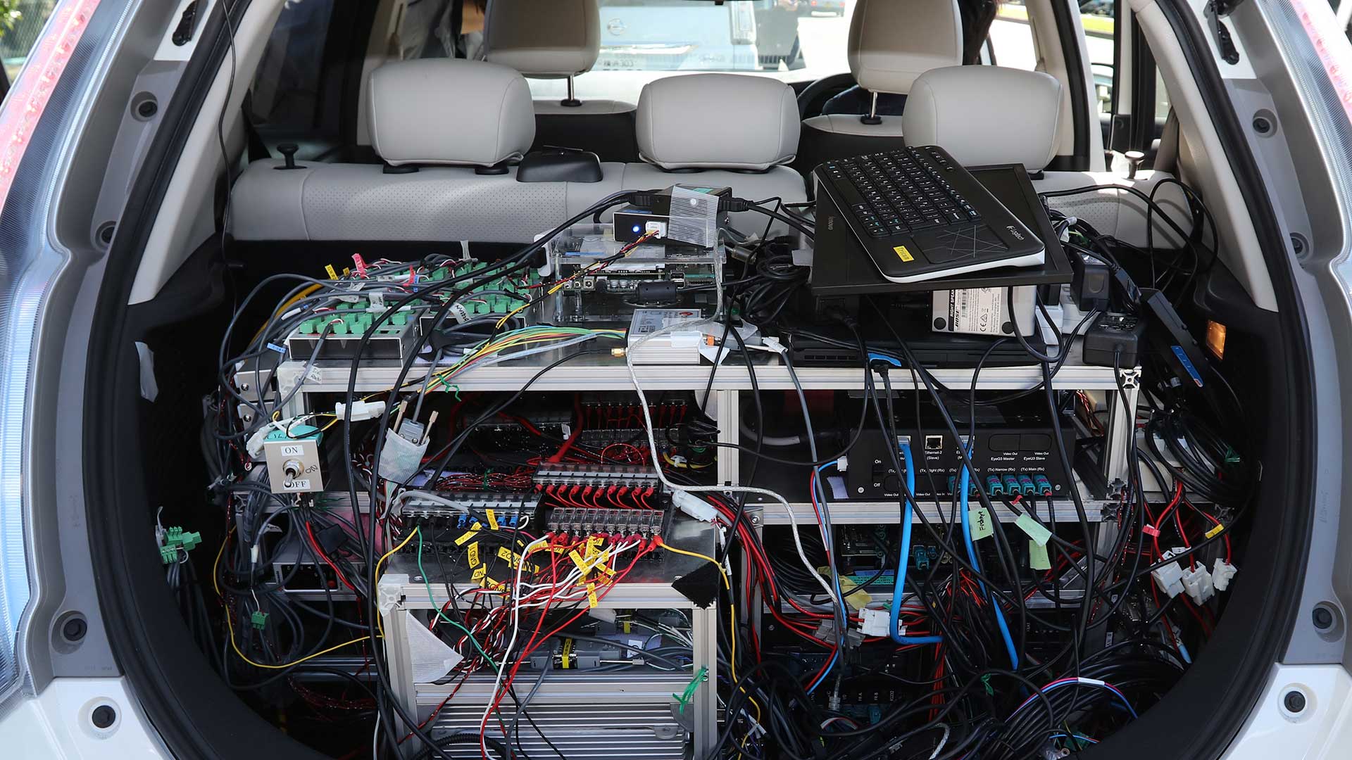 The computing power is mounted in the rear hatch—or, rather, it is the hatch; racks of wires, processors and heat-sinks occupy the entirety of the cargo area. “We will plan to shrink it down with more powerful processors, two or three times as fast,” says Tetsuya Iijima, head of Nissan’s autonomous vehicle program and our guest operator for a 20-minute course around Tokyo. “The additional weight of the system must be below that of one person,” he adds. Specifications on how big a person were not made available, despite repeated requests.