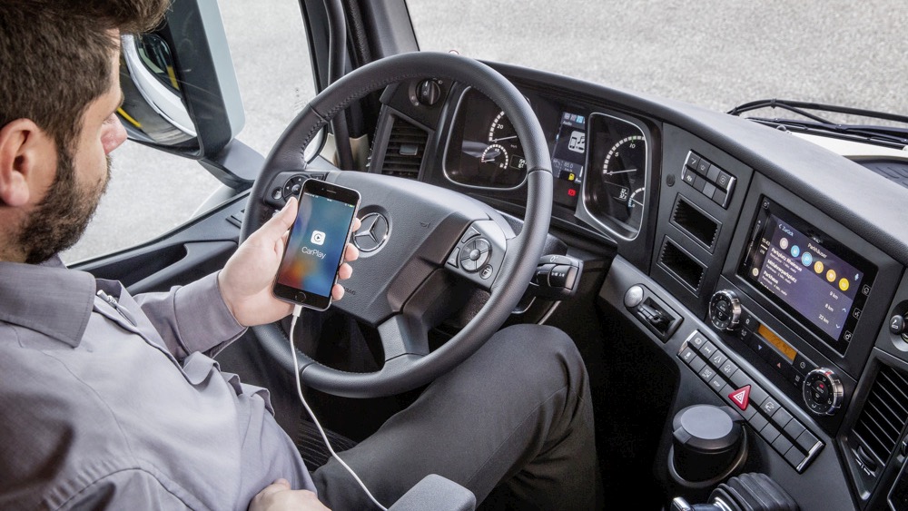 Apple CarPlay continues to slowly proliferate across the ranks of new passenger cars, but what about big commercial trucks? Well, truckers, worry no longer: Mercedes-Benz now claims to be the first manufacturer to offer CarPlay in big rigs. The smartphone-connectivity feature is being added to the Actros, Antos, and Arocs trucks in Europe. Android users get MirrorLink, instead of the brand-specific Android Auto system usually paired with CarPlay in new vehicles.