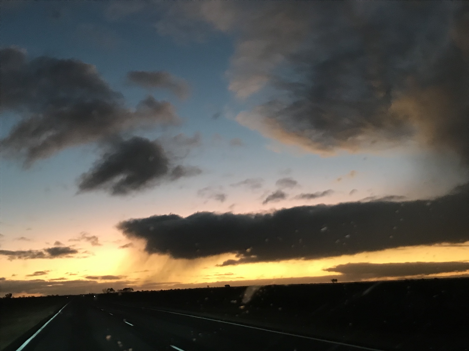 With no turns to make for well over an hour, and no headwinds to push through, this became the relaxing end to the day we needed. The sun dyed scattered thunderheads in shades of sherbet as it sank; the trees gradually returned to flank the road. We had no concerns about range, having tweaked our plans to briefly stop in Balladonia for dinner and a charge—expensive though it may be, at $1 AUD per kWh.