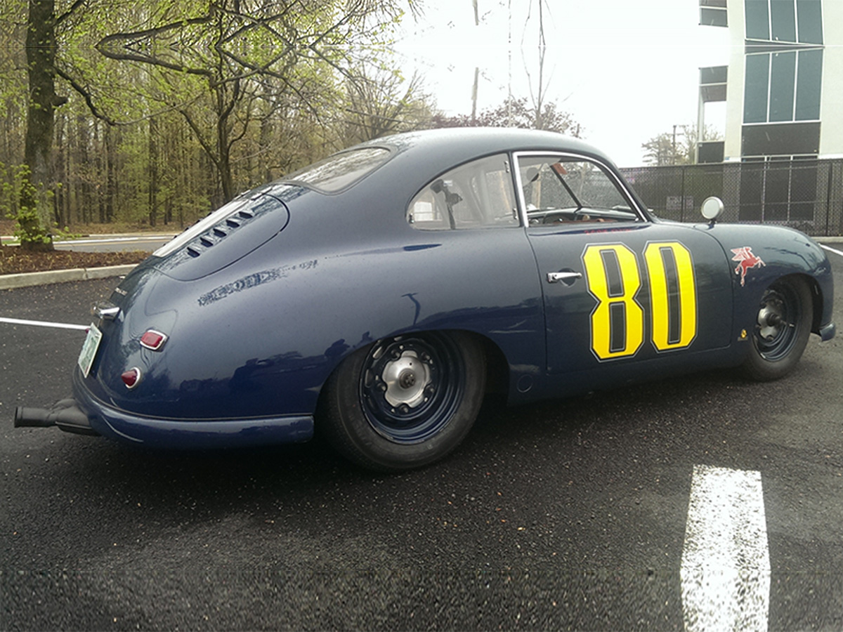 We’ve rendezvoused at a steakhouse parking lot in New Jersey, where Emory’s close friend and racing partner Chris Ridgway arrives with cars he trailered though the night from New Hampshire. Besides Emory’s old No. 80 racer, a sinister black ’57 Emory 356 shows what six figures can buy a Porsche fanatic. It’s a gorgeous ground-up restoration with disc brakes and a modernized independent rear suspension in place of the original swing axle unit. A Porsche 914 engine is stuffed in back, bored and stroked to 2.65 liters and making a robust 205 horsepower – in a 356 that weighs maybe 1,900 pounds.