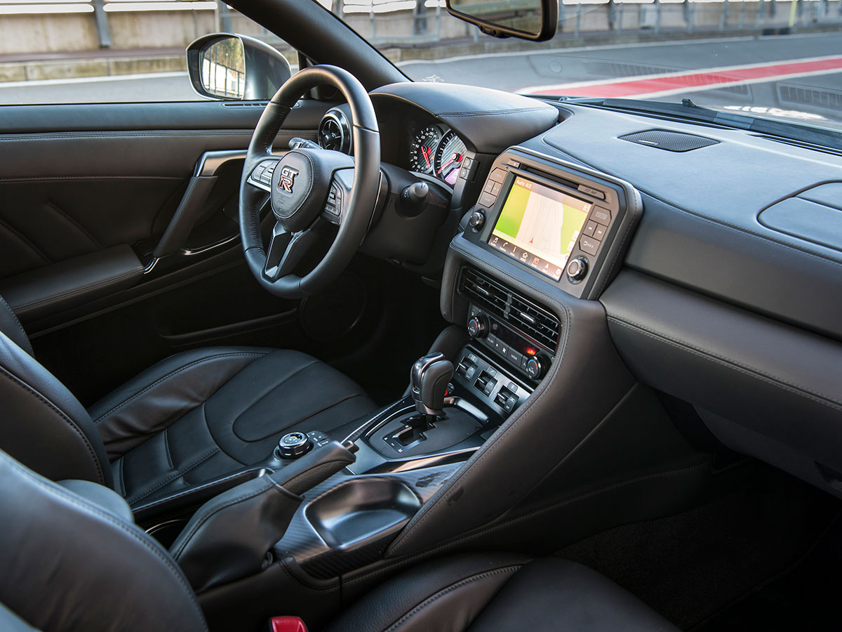 A Corvette or Porsche 911 is still quieter. But a day in the GT-R no longer feels like being jammed in the engine hold of a cigarette boat as it bashes the waves. A new acoustic windshield ably smothers road noise. The Nissan’s wearying gear whine and driveline thunks are largely washed away. The structure is more rigid, including around the window frame. Anti-sway bars are stiffer than before, spring rates unchanged. But a more-generous envelope for dampers pours some sugar on the ride while boosting agility; Nissan claims the GT-R is four percent faster through slaloms. Lightened sport seats with reworked bolsters also go the distance for all-day comfort.
