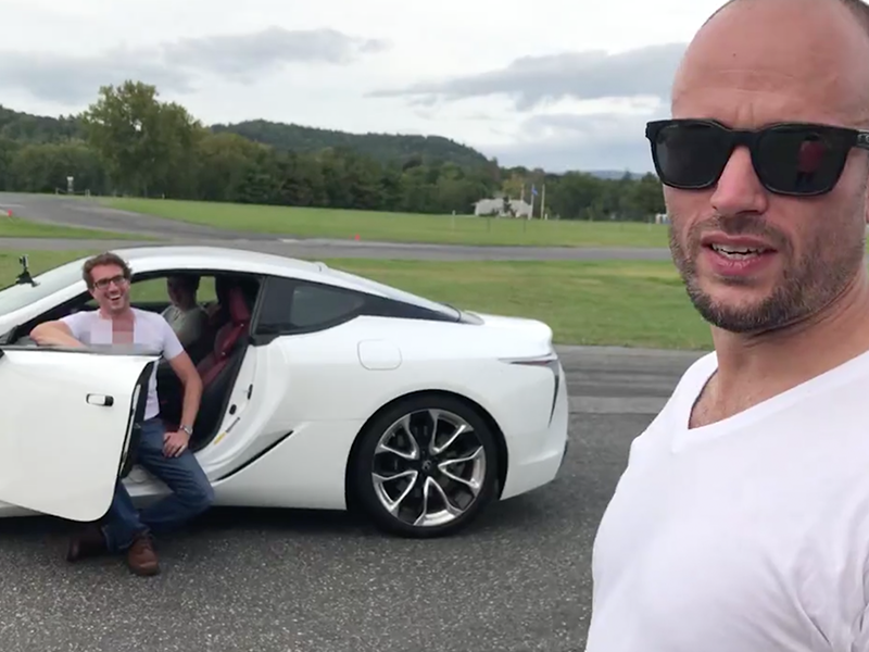 Well, lucky for Josh and me, we wound up having to deal with two of those bad options simultaneously. The final ruling: Each of us would do two laps of the Lime Rock autocross behind the wheel of the Lexus LC500 with supervising producer Cait Knoll sitting shotgun, figuratively spraying us with questions—and literally spraying us with a cut-rate knockoff of an Abercrombie & Fitch scent she’d had since high school that smelled like Limp Bizkit sounds.