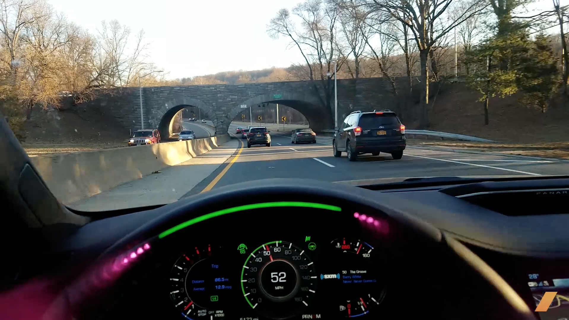 But as our Alex Roy noted in his head-to-head comparison with Tesla’s competing Autopilot, the Cadillac’s major edge is its Driver Monitoring System. Six infrared emitters in the steering wheel rim illuminate the driver’s face, while a camera and software monitor facial position, eyelid movements, and the focal point of the driver’s pupils. Like a semi-autonomous Santa, the system sees you, and it knows when you’re awake. During my test drive, Super Cruise let me glance away from the road for just under five seconds—plenty of time to, say, adjust the radio station—before the car’s steering wheel rim flashed its disapproval. (One aesthetic note on the test video: The infrared emitters that appear as six purple lights on the steering wheel, three on each side of the longer green bar, are barely visible to the naked eye; the glowing effect you see is created by my cellphone camera. The Cadillac’s wheel doesn’t actually look like a string of Christmas lights.)