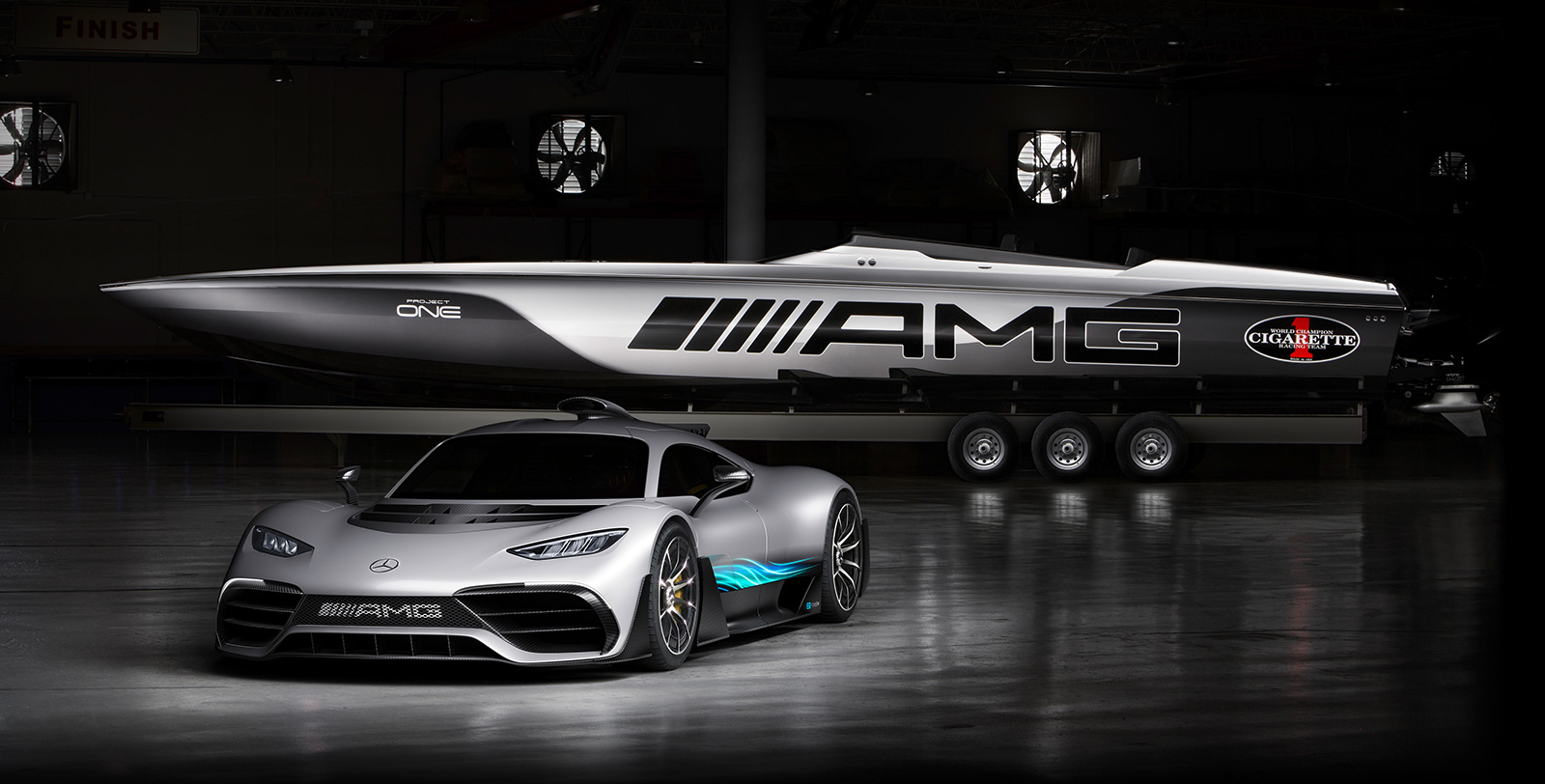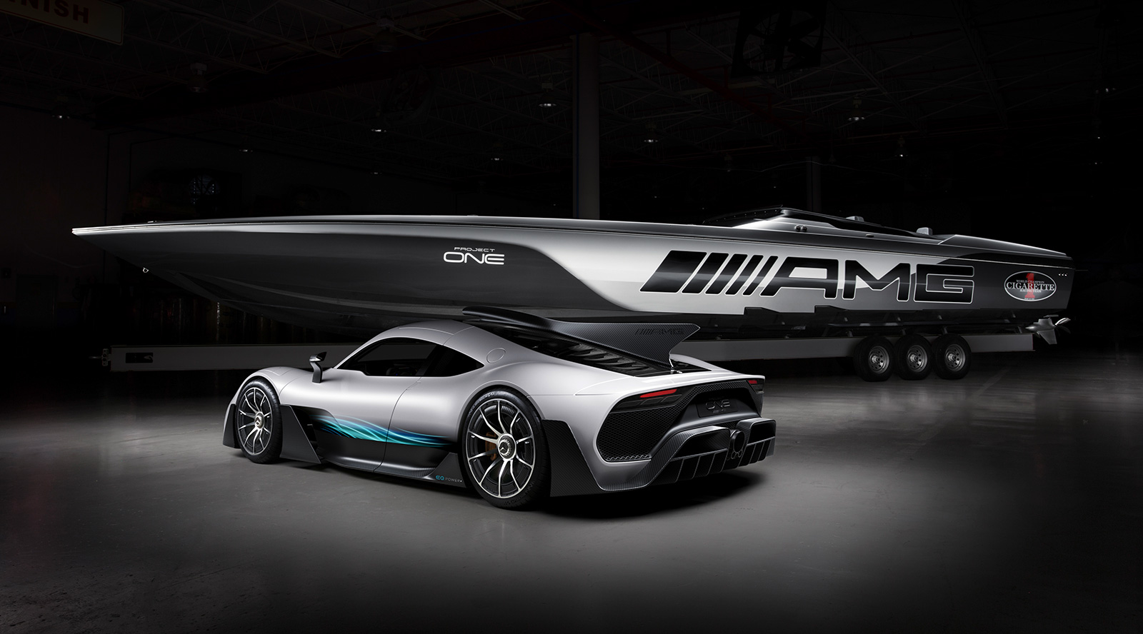 To start with the obvious question: No, the Cigarette Racing 515 Project One speedboat doesn’t use Mercedes-AMG engines. While it’d be easy to assume as much from the massive AMG logos smeared across its flanks, this manned warhead of a motorboat is driven through the water by a pair of 9.0-liter Mercury Racing V8s that each generate 1,350 horsepower on 91-octane gasoline and 1,550 ponies on race fuel. That’s around 30 percent more power than the upcoming Mercedes-AMG Project One hypercar it shares part of its name with…though the super-limited-run sports car’s Formula One-derived turbocharged 1.6-liter V6 hybrid will make its output a bit more efficiently than the boat’s giant engines. (Fun fact: At a combined 3,440 pounds, the twin Mercury motors alone weigh roughly a quarter-ton more than the entire Project One hypercar is expected to tip the scales at.)