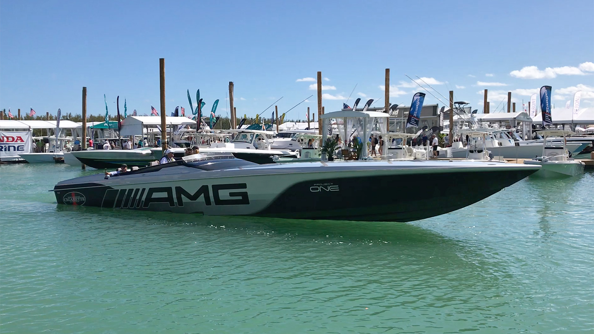 As with all Mercedes-Benz’s high-performance division’s input into its ninth collaboration with Miami-based speedboat builder Cigarette Racing, AMG’s involvement is largely limited to the design and branding of the boat. Daimler’s chief design officer Gordon Wagener worked on the design on the 2018 boat himself—and as if a Mercedes-Benz USA spokesperson’s declaration of the design boss’s enthusiasm for the project weren’t proof enough of his belief in the AMG/Cigarette partnership, his decision to fly over to the Miami Boat Show to take a ride on the boat along with a gaggle of assembled journalists was a pretty strong testament to it.
